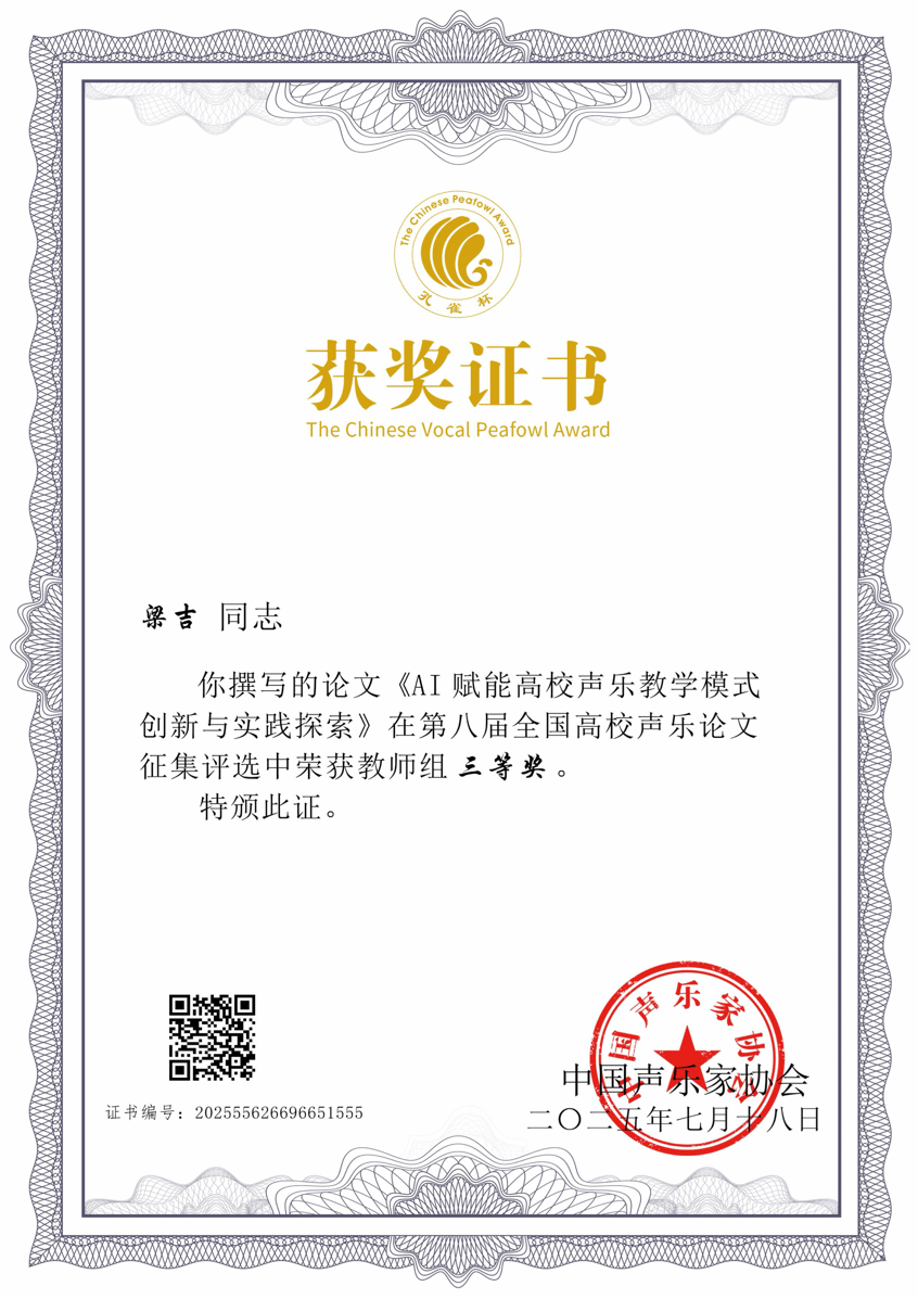 此次全国高校声乐论文征集评选活动,由中国声乐家协会主办,旨在促进高校声乐学术研究的交流与发展,吸引了来自全国众多高校声乐教师的积极参与。梁吉老师的论文《AI赋能高校声乐教学模式创新与实践探索》,聚焦当下人工智能技术在高校声乐教学中的应用,深入探讨了如何借助AI技术创新声乐教学模式、提升教学效果,为高校声乐教育的发展提供了新的思路和实践参考。