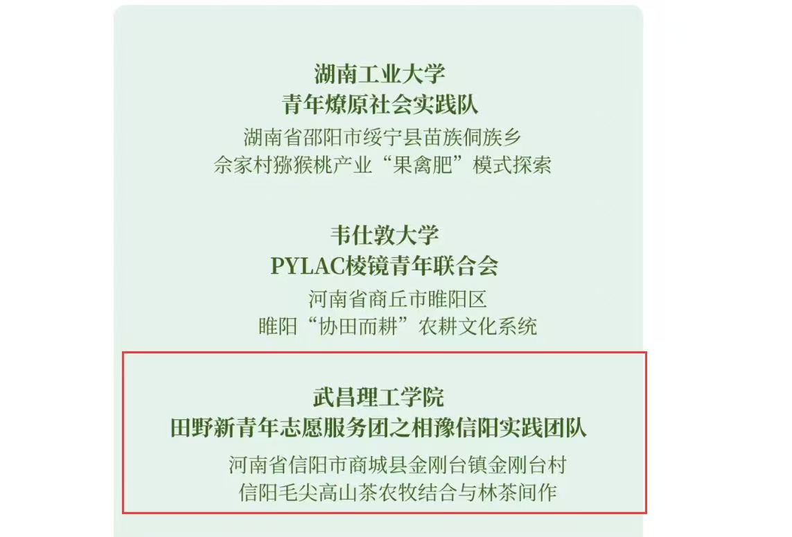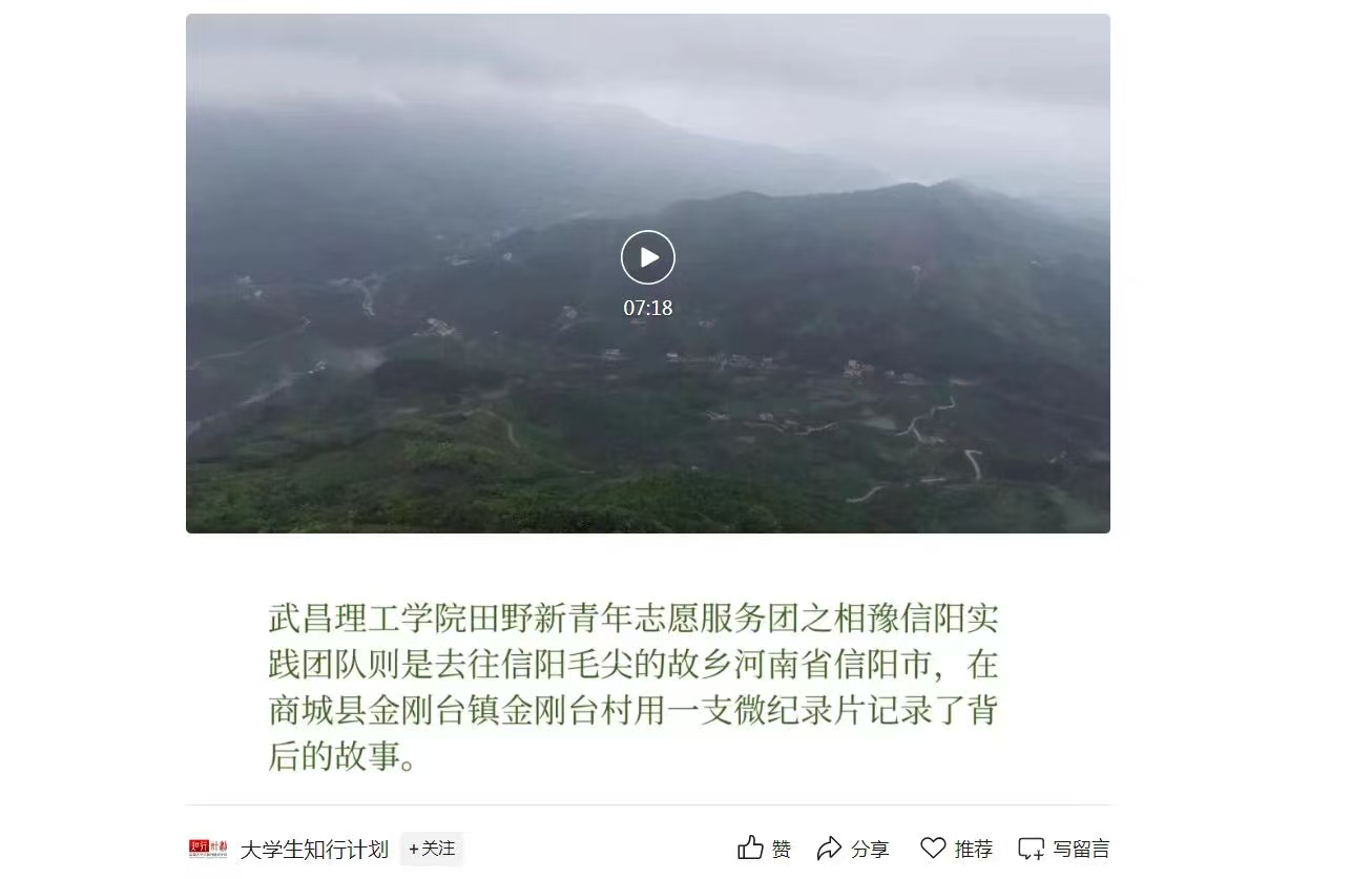 中南在线11月19日消息(通讯员 杨怡 报道)近日,在中国大学生知行促进计划“Change Maker农业文化遗产青年创变者行动”全国评选中,武昌理工学院影视传媒学院田野新青年志愿服务团之相豫信阳实践团队脱颖而出。其中“信阳毛尖高山茶农牧结合与林茶间作”项目获评全国优秀案例,主题微纪录片同步入选“农遗青年传播案例库”,以青年视角为千年茶韵注入时代新声。