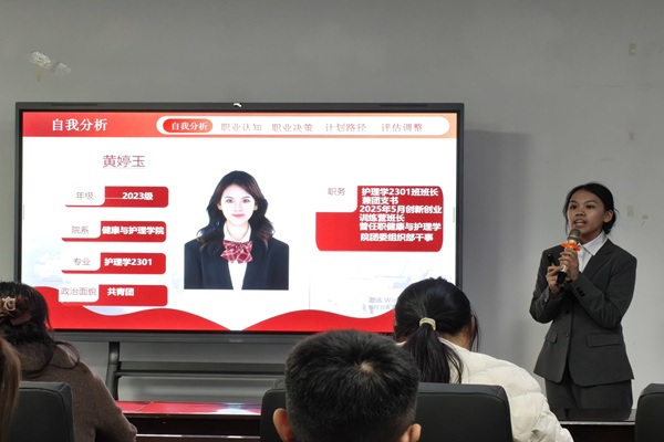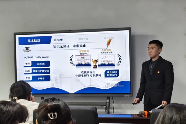 在演讲活动中,各班同学也围绕各自的职业理想展开了精彩的分享。他们不仅通过PPT清晰地展示了个人成长经历,也彰显扎实的学业基础。同时,同学们突出强调了自身逻辑思维敏锐、表达能力突出等个人优势,展现了全面发展的综合素质。更有同学结合自己志愿服务经历,生动讲述了这些实践如何为未来的教学工作积累鲜活素材。他们将理论与实践紧密结合,职业规划清晰明确,实践过程扎实有力,赢得了现场师生的阵阵掌声,充分体现了新时代护理学子积极向上、勇于担当的精神风貌。