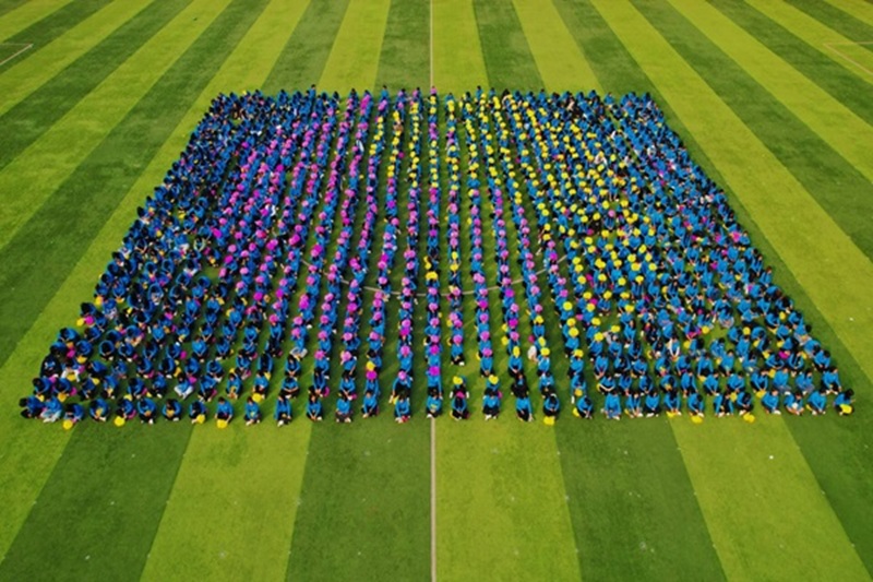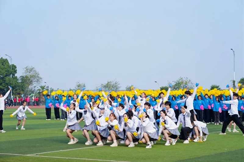 “让我们一起出发吧,让梦想都开花!”团体操方阵迅速进入场地,手持粉色和黄色的花球,伴着背景音乐《让我们一起出发》,踏着欢快的节奏,如同精灵一般灵动地跳动。随着音乐节奏的加快,团体操方阵的队员们开始变换队形。他们手中的花球随着动作上下翻飞,为整个运动场添加了一抹亮色。队员们的动作整齐划一,充分彰显了武昌理工学子的青春活力。