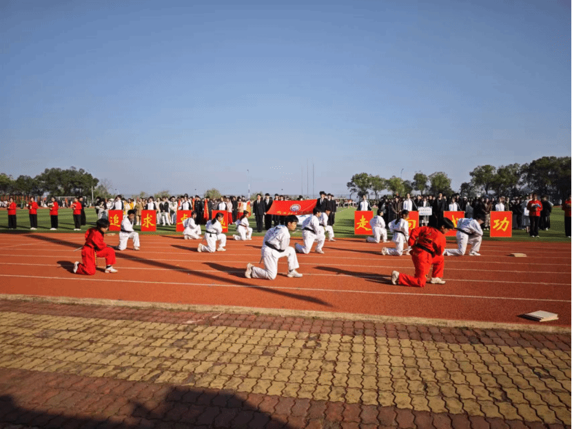 兰亭序表演方阵率先登场,身着素雅服饰的学子身姿翩跹,舞步随古乐流转,将《兰亭序》的笔墨雅韵与肢体美感相融,尽显中华传统文化的雅致底蕴。随后,武术表演《霍元甲》震撼亮相,表演者拳脚铿锵、招式利落,每一次出拳都裹挟热血气势,每一次转身皆彰显武魂担当,生动诠释“强国强种”的精武精神,引得现场掌声不断。