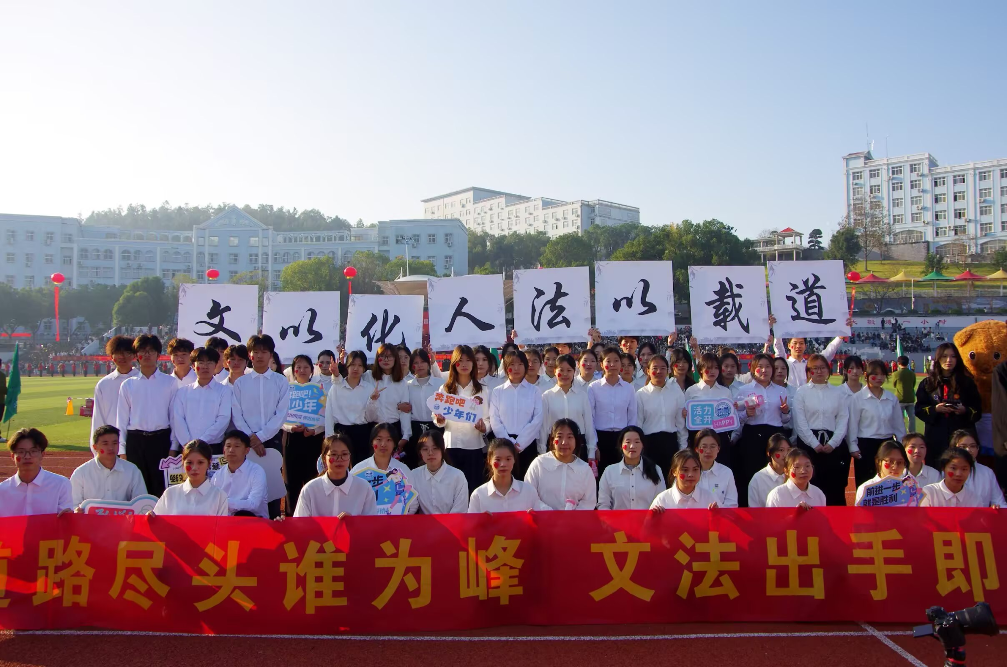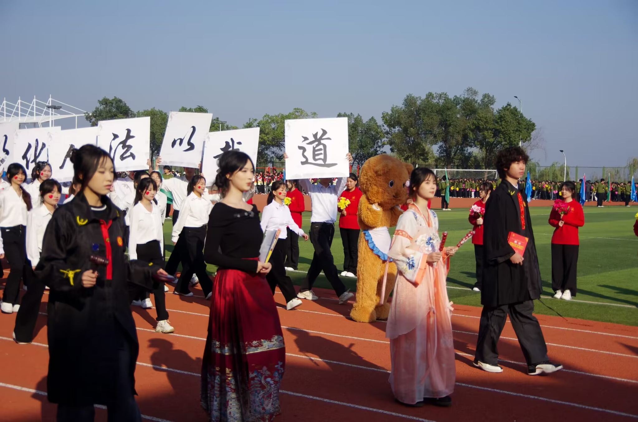 在激昂的运动员进行曲中,开幕式正式拉开帷幕。各学院方阵依次走过主席台,接受检阅。当文法学院方阵迈着整齐划一、铿锵有力的步伐入场时,瞬间吸引了全场的目光。他们身着统一的服装,精神抖擞,意气风发。震耳欲聋的口号声,充分展现了文法学子沉稳坚毅、积极向上的精神风貌。