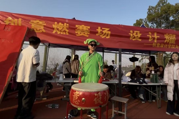 在创意设计学院的大本营前,一面大鼓成为赛场的“活力符号”。团学成员们轮番上阵,敲响大鼓,激昂的鼓点与赛场的呐喊声交织,点燃了整个赛场的热情,为运动员们的拼搏助威呐喊。当运动员们在赛场上拼尽全力后,团学成员与志愿者们第一时间上前,小心翼翼地搀扶着他们用细致的关怀为运动员们驱散疲惫。