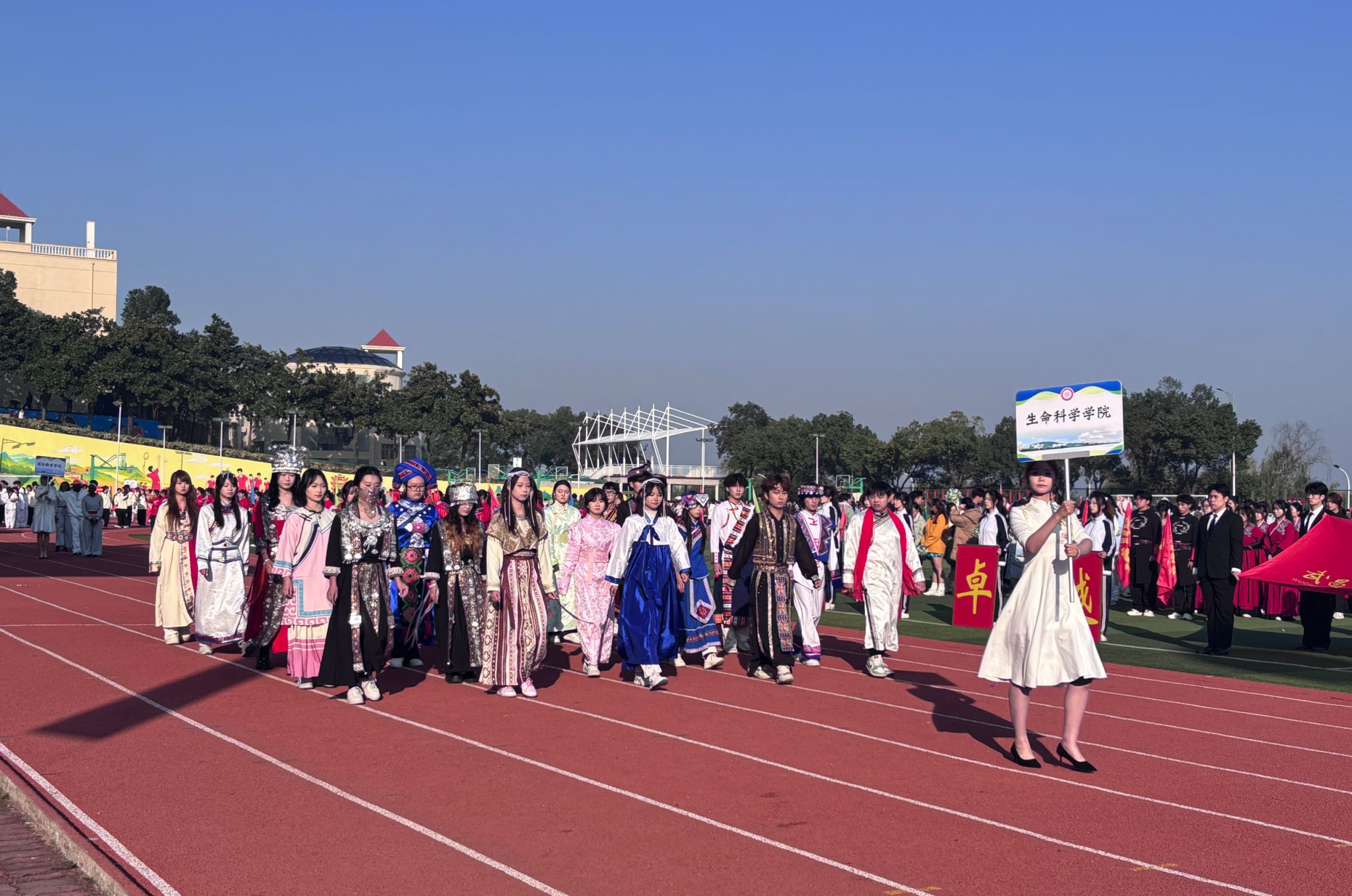 方阵未至,气势已燃。生命科学学院的表演方阵甫一登场,便以浓郁的民族服饰与整齐的队列造型成为焦点。身着绚丽民族服饰的学子们,眼神满是昂扬与期待,以整齐队列伫立,精致服饰纹样与蓬勃朝气相映,成为亮眼风景,提前点燃赛场氛围。一声发令枪响划破天际,运动会开赛,赛道上运动员奋力向前奔跑,尽显拼搏姿态,生科学子挥动双臂、齐声呐喊,以饱满热情助威,民族风情与青春活力交织,为赛事浓添热血气息。