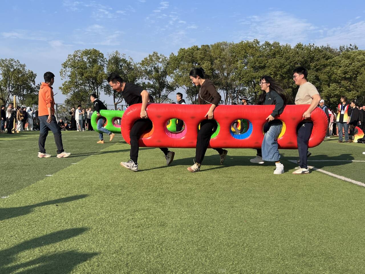 比赛现场,教职工们纷纷换上轻便的运动装,以饱满的热情组成参赛队伍投身其中。“共赴未来”项目要求队员们同心协力,借助道具共同完成模拟“搭建未来之路”的闯关任务,大家相互配合、默契十足,或稳步推进,或灵活调整。全体教职工们共同推动巨型“未来号”充气模型冲向终点,呐喊声、加油声此起彼伏,将现场气氛推向高潮。平日里在讲台上传道授业、在办公室伏案耕耘的老师们,此刻全然释放活力,脸上洋溢着灿烂的笑容,展现出与课堂上截然不同的鲜活风采。赛道上不时响起阵阵呐喊与欢笑。