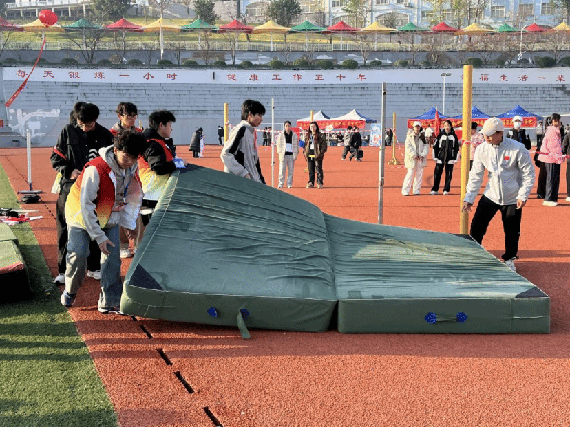 比赛尚未开始,来自各院系的20余名运动员精神抖擞,在赛前认真热身,调整状态。志愿者们也忙碌开来,他们两人一组,合力将海绵垫平铺整齐,反复按压边角确保无褶皱。志愿者手持卷尺仔细校准横杆高度,与裁判核对数据后用记号笔做好标记。志愿者穿梭在赛场周边,摆放指示牌、分发饮用水,同时耐心引导选手到指定区域热身用细致的筹备为比赛筑牢安全与有序的基础。