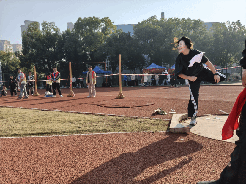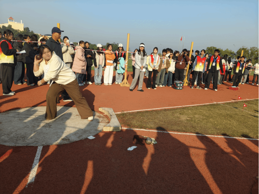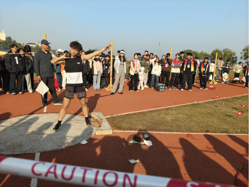 各学院运动员提前到达赛场,检录处完成检录后,经比赛工作人员核对无误,26名运动员便奔赴赛场。参赛的运动员按照预先安排的顺序依次入场,他们来到指定的投掷区域,准备完成各自的技术动作。从持球姿势到发力投掷,每一个环节他们都力求做到规范、标准。运动员们将铅球稳稳地置于肩颈之间的锁骨窝处,随后进行侧身、蹬地等一系列连贯的动作,最终将铅球奋力投掷出去,铅球在空中划出一道优美的弧线。