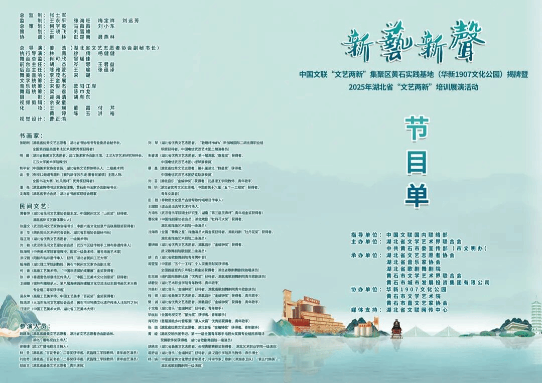 武昌理工学院影视传媒学院表演系的林圣、刘岩奇两位老师表演了原创快板《两新谱新篇》。活动由快板《文艺两新谱新篇》拉开展演序幕,展示湖北省“文艺两新”成果,从湖北“文艺两新”发展脉络、“三个一百”文艺工程、文艺志愿服务与“文艺两新”有效结合、新文艺群体职称评审等方面呈现湖北“文艺两新”的接续发展历程。
