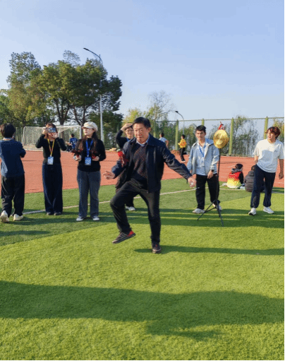 活动在秋日暖阳中拉开帷幕。教职工们陆续抵达田径场签到,随后自由参与三项趣味挑战游戏:“一锤定音”“圈住好运”和“毽舞飞扬”。游戏中,老师们或蒙眼转圈敲锣,或专注投掷套圈,或灵活踢毽计数,展现了课堂之外的活力与风采。每成功通关一项挑战,即可兑换一个精心准备的“防流感香囊”,既增添了趣味,也传递了学校对教职工健康的深切关怀。