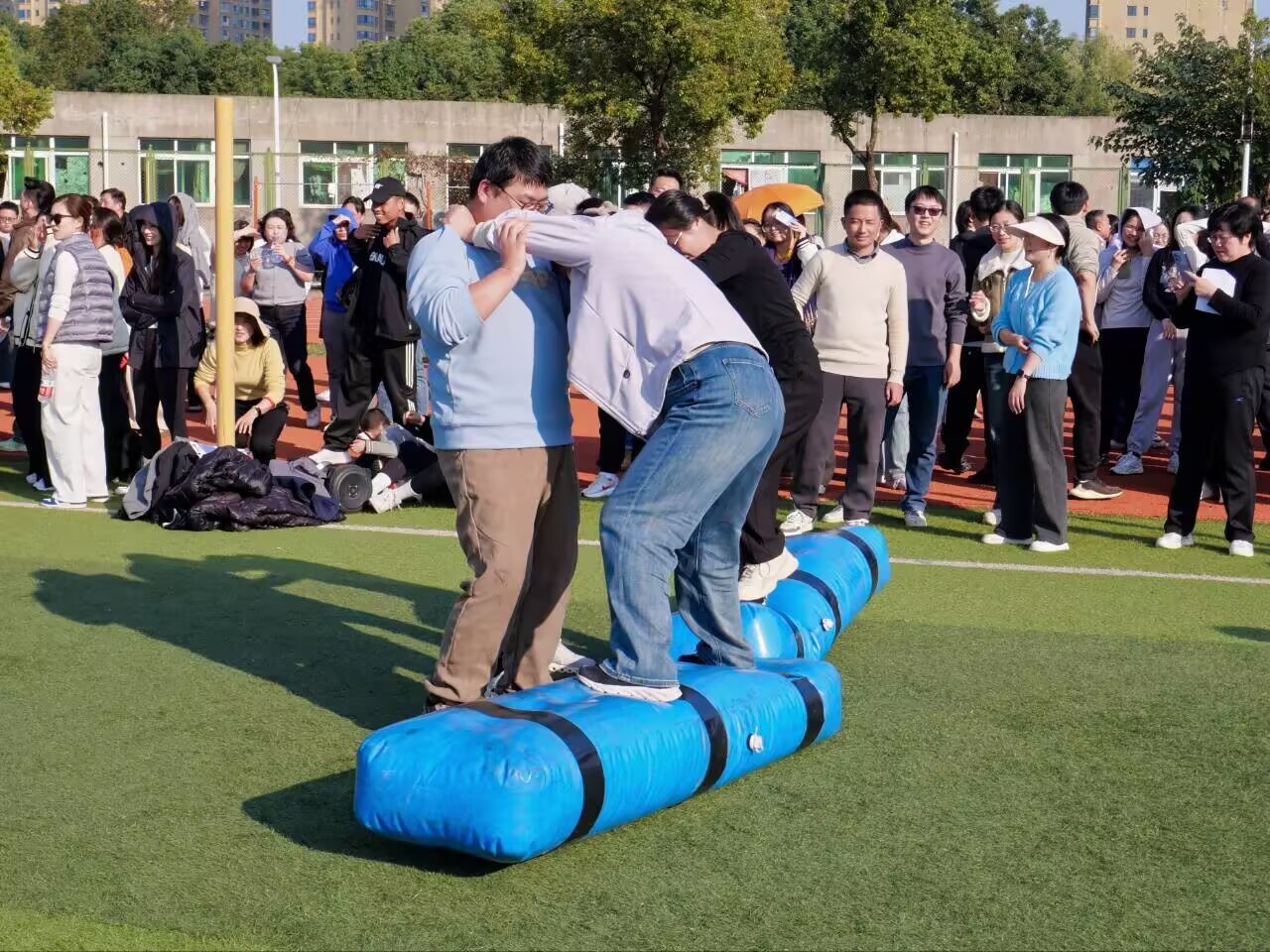 赛场上,众多教职工正摩拳擦掌准备教职工趣味项目中的“同舟共济”比赛。换上运动装的教职工们,各个热情洋溢,全身心的投入到活动中。参与活动的老师需要用两块充气垫交替铺路,四人一组迎面接力,队员必须踏气垫而行,脚落地则为犯规,落地一次罚五秒,全程三十米,以用时长短排名。这些规则既保证了团队力量的协调、强化了队员间的配合度,还进一步考验了团队的节奏把控能力。