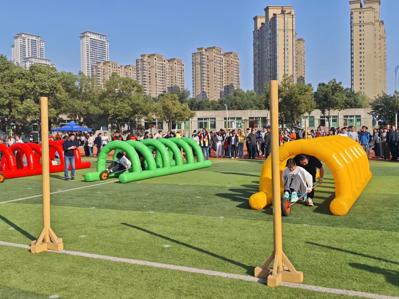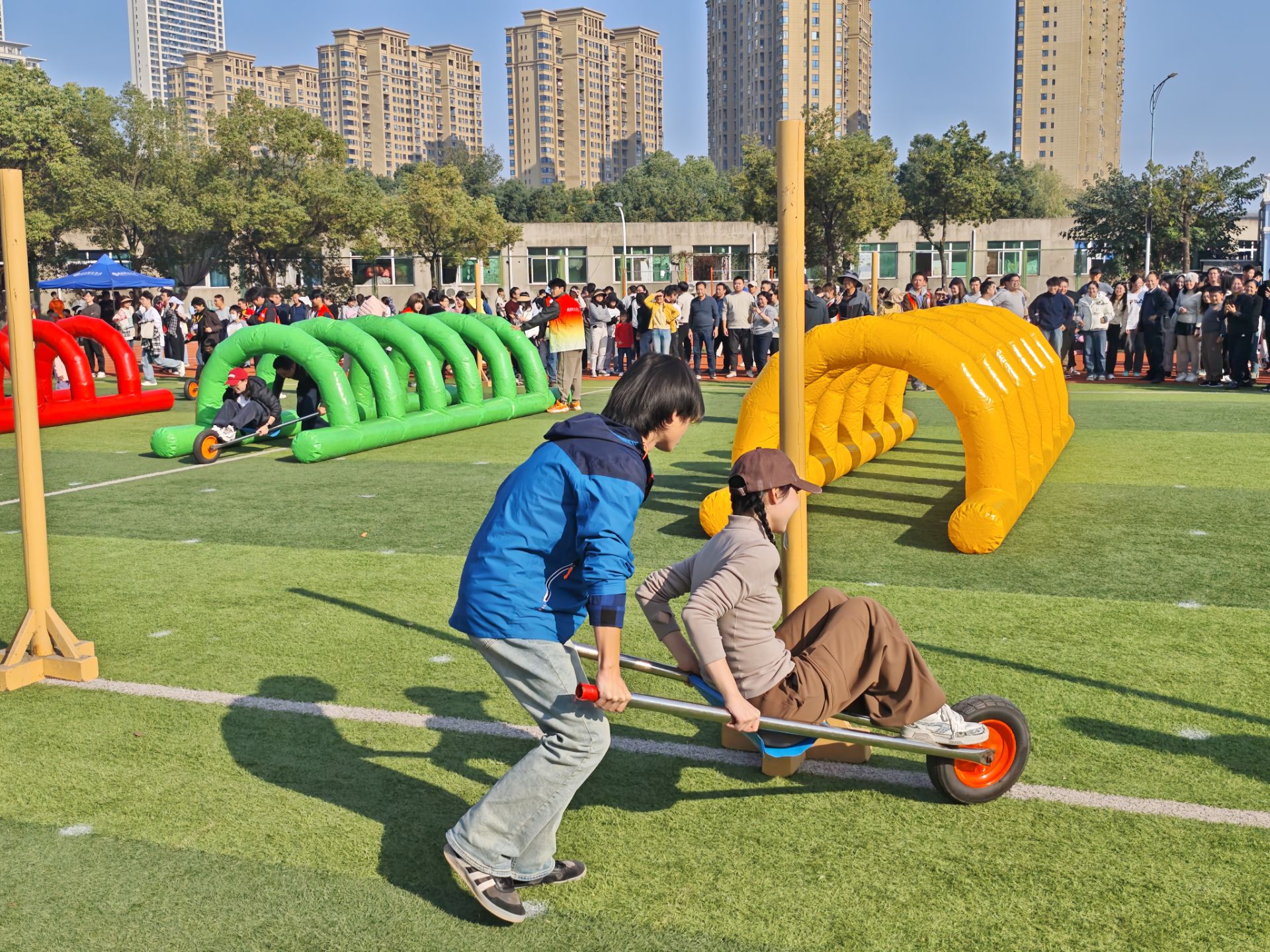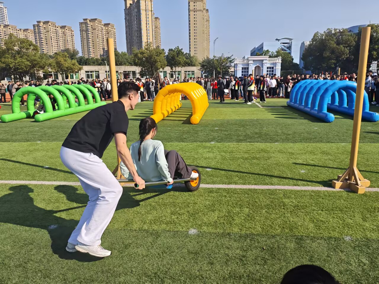 随着发令哨响,首组男队员迅速推车出发,载着女队员向30米终点疾行,步伐稳健又不失速度;抵达终点后,下一组队员立刻衔接,男队员熟练操控独轮车折返,女队员稳稳坐定配合前行。赛场上,各队节奏紧凑,男队员们全力把控车辆平衡,女队员们默契配合保持稳定,每一次交接都尽显团队协作的默契。