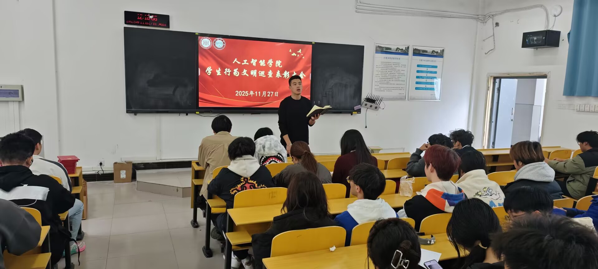 中南在线11月28日消息(通讯员 曹伟华 熊玮鹏 报道)为总结学生行为文明巡查成果、表彰先进典型,11月27日,武昌理工学院人工智能学院在319教室举办“巡查行为规范,助力文明同行”巡查表彰大会。人工智能学院团委书记余阳出席本次大会,人工智能学院学生自律委综合事务部、监察部全体成员及文明巡查志愿者共同参加此次会议。