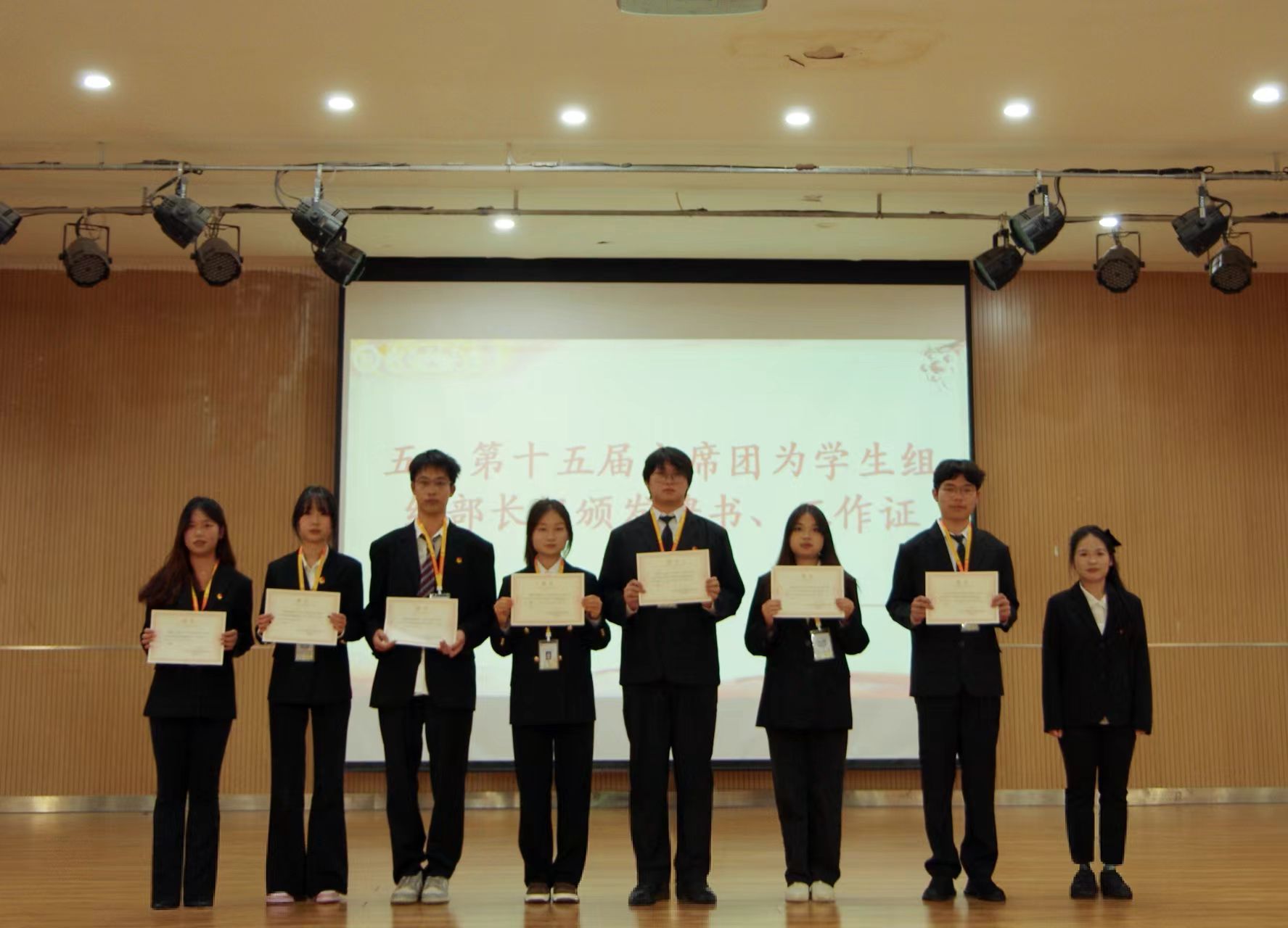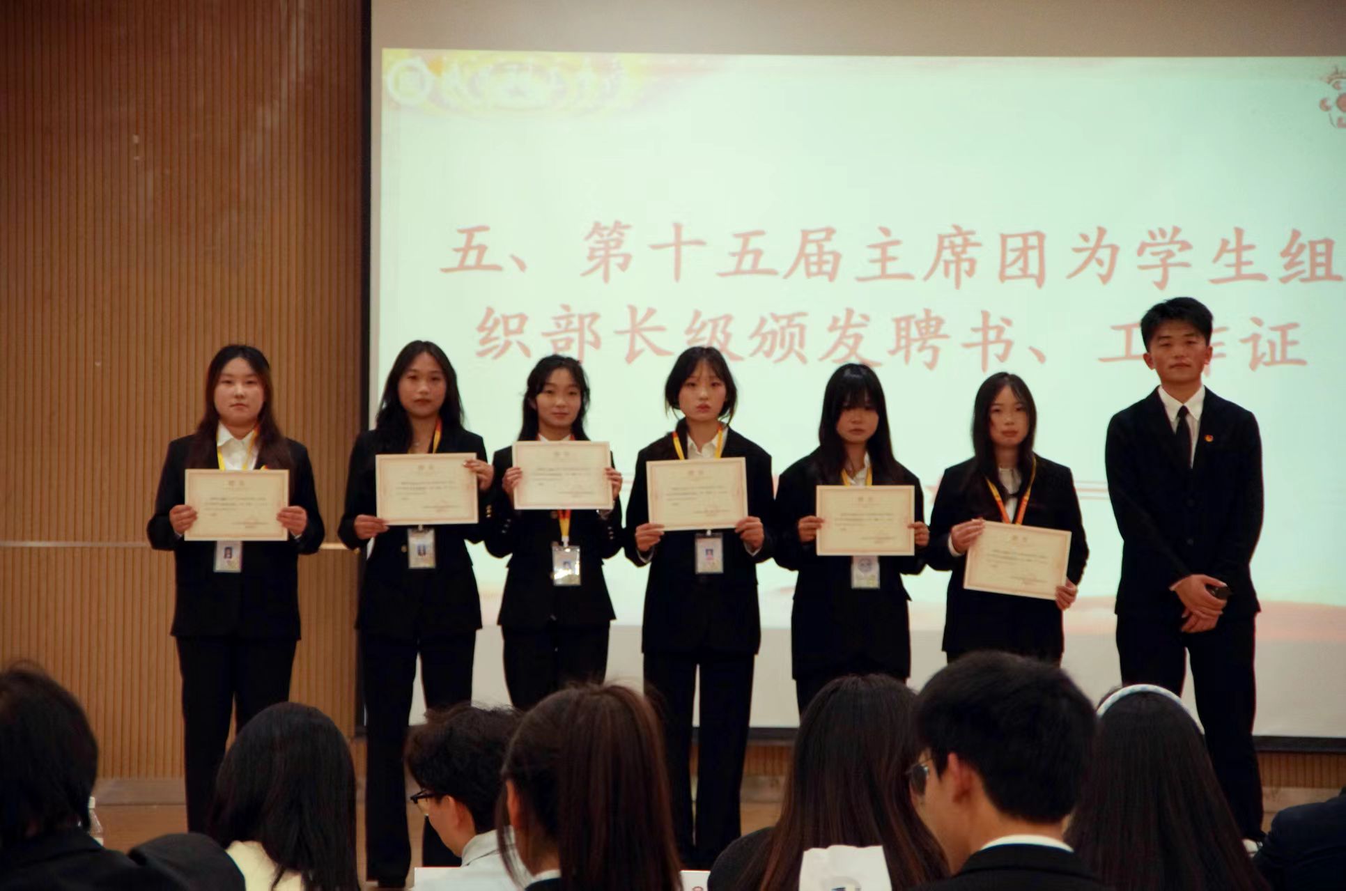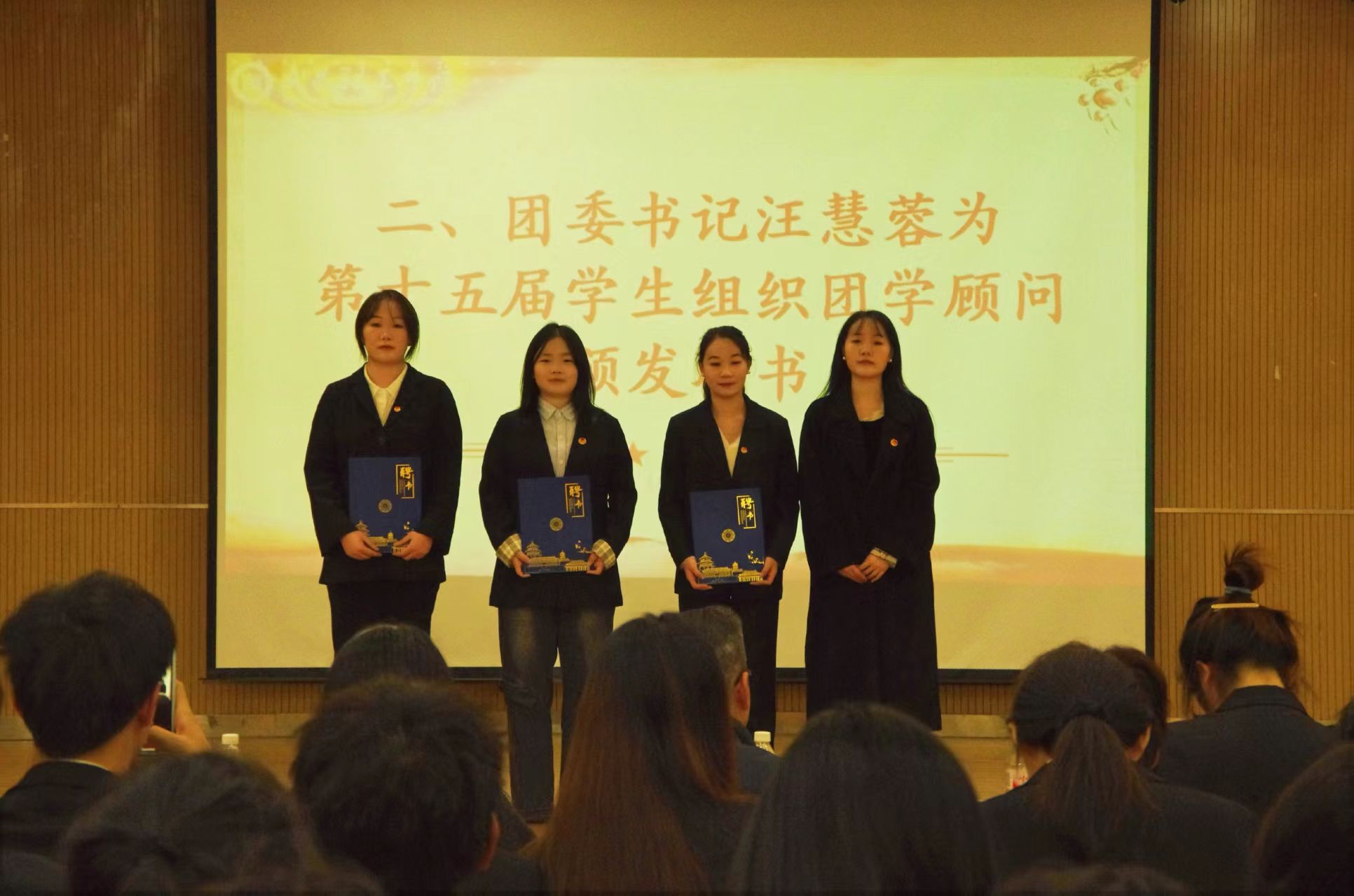 在庄重的聘任仪式上,学院领导及老师依次为新任学生骨干颁发聘书与工作证。汪慧蓉书记宣读第十五届学生组织任职文件,并为团学顾问余莹、宋欣煜、张静怡颁发聘书。随后,新一届主席团成员为各职能部门部长及社团负责人颁发聘书。