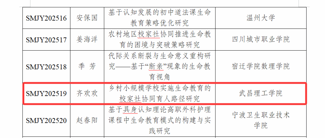 中南在线12月8日消息(特约通讯员 黄文姬 齐欢欢 报道)近日,中国陶行知研究会公布2025年度“生命教育”专项课题立项通知,武昌理工学院马克思主义学院齐欢欢老师申报的《乡村小规模学校实施生命教育的校家社协同育人路径研究》成功立项(项目编号:SMJY202519),这是学校首次获批该研究会课题,此次全国仅有39项课题立项。