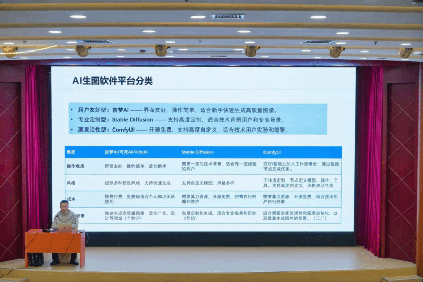 崔皓老师围绕AI绘画和视频剪辑两大核心领域展开讲解。在视频剪辑板块,崔老师对比了剪映、Premiere、Final Cut三款热门软件的难度、功能、平台兼容性和成本,详解剪映从导入、粗剪、精剪到包装、导出的核心工作流程,重点教学智能字幕、音乐添加和特效应用,并结合实际案例演示调色、卡点等实操技巧。AI绘画板块则介绍了即梦AI、Stable Diffusion、ComfyUI三款主流工具,通过表格对比其操作难度、风格适配性与适用场景,拆解“主体+风格+细节+氛围”的描述词公式,简化参数设置,并现场演示文生图、图生图、局部重绘等关键技术,让初学者能快速掌握核心操作。