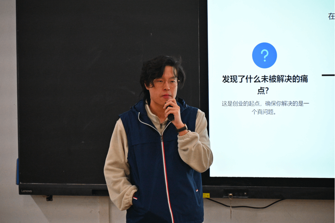 活动伊始,计科2403班李佳宸以《从0到1:创业思考分享》为主题,从“为什么是你”“需求验证”“搭班子”等维度,面向创业初期群体展开系统阐述。针对“把融资当终点”“把情怀当需求”等常见认知误区,他结合“创业初心三问”与“四步漏斗验证法”的核心思路,搭配股权分配原则、前10号员工梯队画像的实例,拆解了从需求到团队的实操框架,为初创者从0到1启动项目提供了清晰的行动指导。