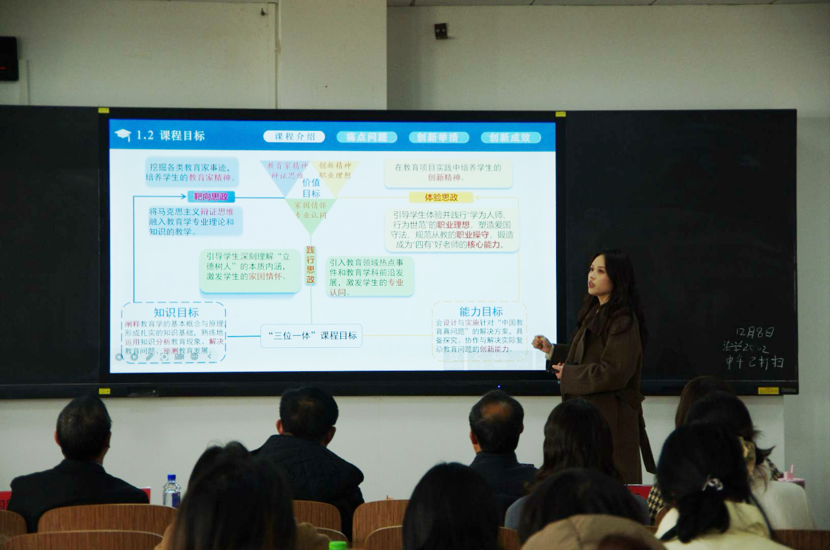 课程思政组的展示紧扣立德树人根本任务。杨玲老师以乡村教育为背景,在《教育学原理》课程中引入PBL(项目式学习)模式,引导学生围绕“美育”这一主题,就其任务、场域、内容与目标展开深度讨论,探索未来教育者的使命。吕明利和汤可老师则分别围绕《刑法二》教学中的思政融入痛点、以及将中国书法喻为“写给世界的中国代码”进行了富有特色的教学创新实践汇报。