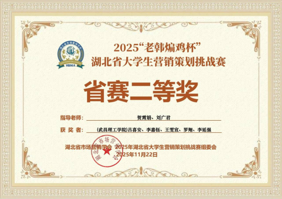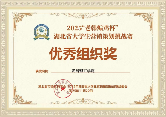 中南在线12月12日消息(大通社记者 郭姿彤 报道)近日,2025“老韩煸鸡杯”湖北省大学生营销策划挑战赛决赛在武昌首义学院圆满落幕。武昌理工学院26支参赛团队历经近三个月的省级赛事层层选拔,凭借扎实的专业功底与创新的实践能力脱颖而出,最终斩获省级二等奖1项、省级三等奖3项。武昌理工学院也因规范高效的组织协调、广泛的参赛覆盖面及团队的优异综合表现,成功获评“优秀组织奖”荣誉称号,充分展现了其在实践教学与素质教育融合方面的显著成效。