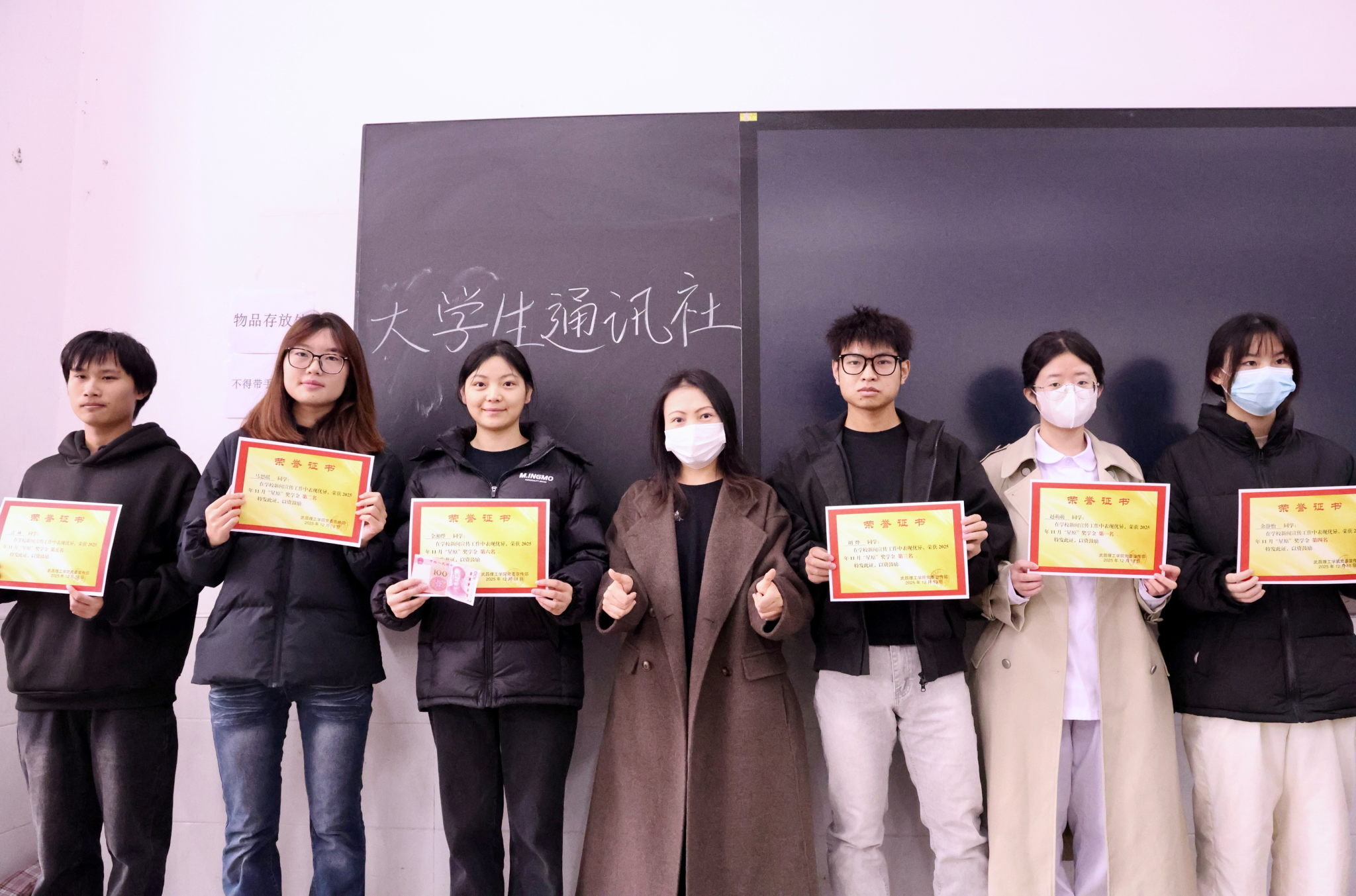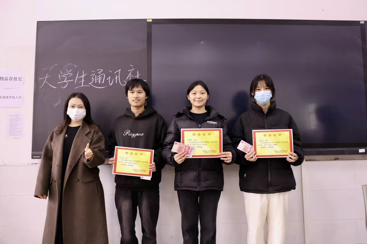 在颁奖典礼上,本月获得奖项的学生分别是赵萌萌、马思琪、胡烨、余静怡、江林和金湘烨。他们按照顺序依次走上台去领取属于自己的荣誉。这些学生以切实的行动履行着大学生通讯社“哪里有新闻,哪里就有大通人”的宗旨。在学校的宣传工作领域,他们不怕辛苦、锐意进取,将自己的精力与智慧毫无保留地投入其中,为学校的宣传工作增添了许多精彩。颁奖环节,周黎老师为获奖学生逐一颁发奖状与奖品,这一庄重的时刻,是对学生们辛勤付出与努力成果的最好见证。颁奖仪式结束后,周黎老师与大通社全体成员合影留念,用镜头定格下这一意义非凡的瞬间。