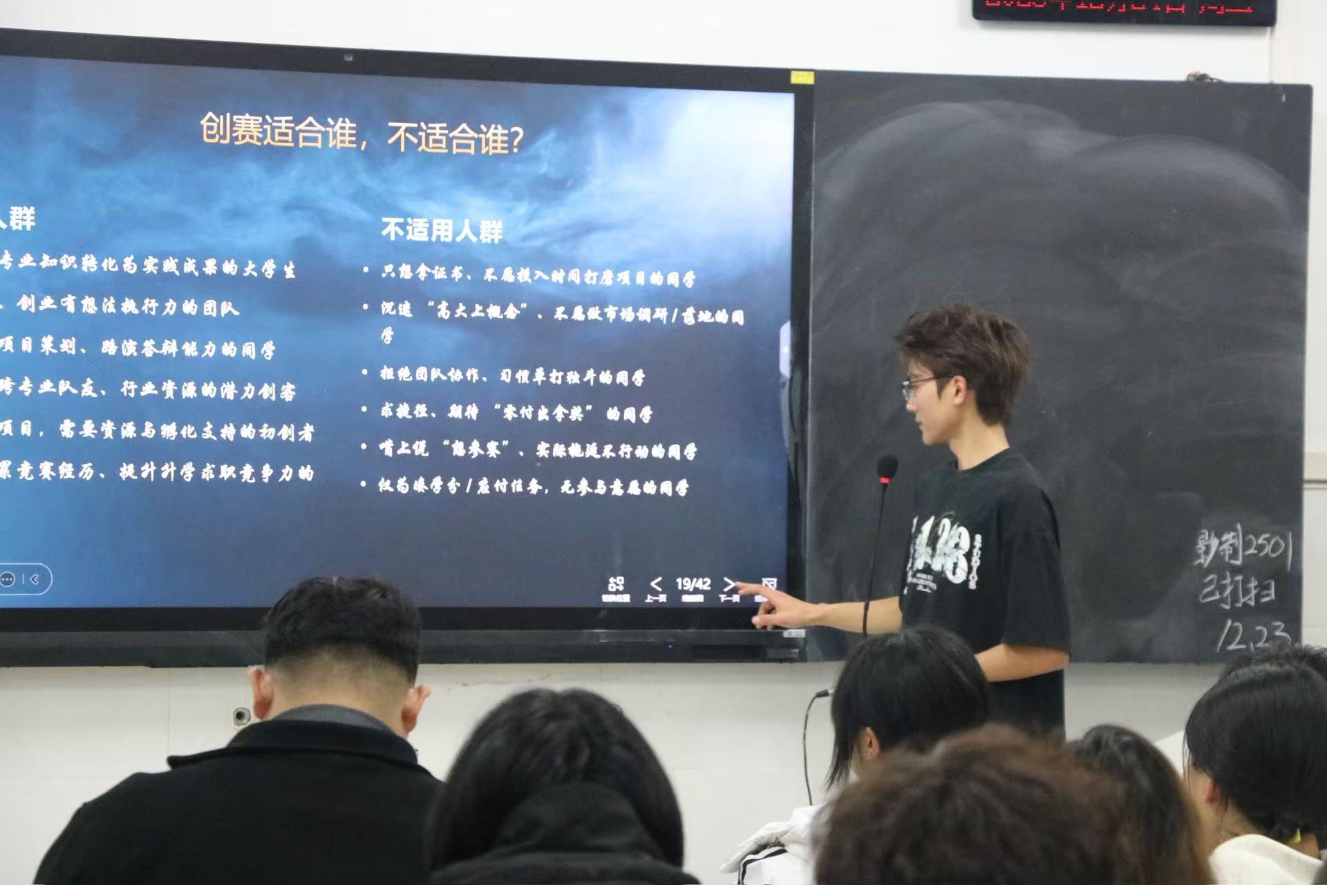 黄国洋结合自身斩获创青春国奖、ican创新创业大赛国家级铜奖等实战案例,讲解了创业变现、零基础创业入门等内容,他从“为什么选择创业”“未来重点投入方向”等维度出发,为学生搭建起跨年级双创交流网络,还针对“大学生如何通过创赛提升个人竞争力”“个人能力的跃迁与身份升级”等核心主题给出实用方法。