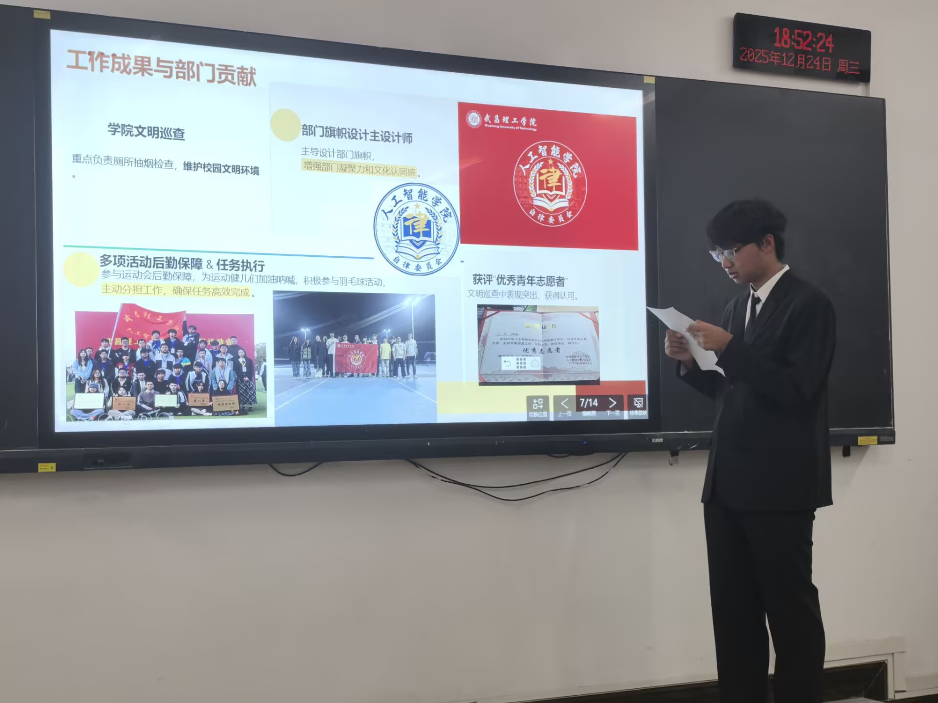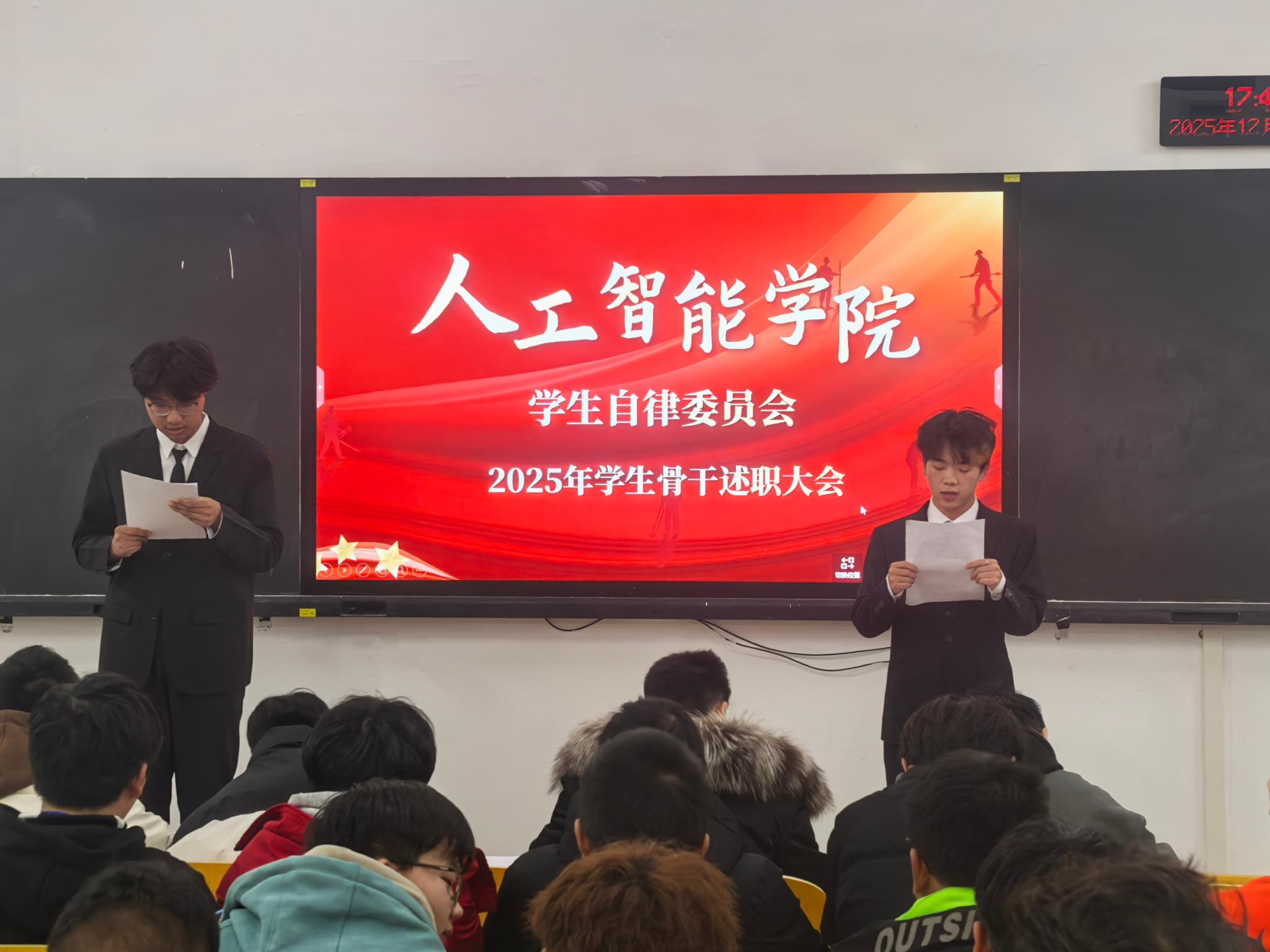 中南在线12月26日消息(通讯员 曹伟华 熊玮鹏 报道)为进一步提升人工智能学院学生自律委学生骨干工作意识与工作能力,人工智能学院学生自律委于12月24日晚在智能320教室开展2025年学生骨干述职大会。人工智能学院团委书记余阳书记,人工智能学院学生自律委全体成员共同参与此次大会。
