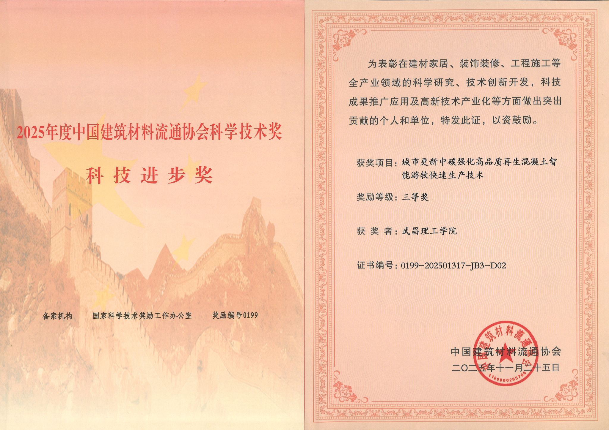 中南在线12月27日消息(特约通讯员 赵峰 报道)近日,2025年中国建筑材料流通协会科学技术奖评选结果正式揭晓,武昌理工学院与武汉建工集团股份有限公司联合研发的“城市更新中碳强化高品质再生混凝土智能游牧快速生产技术”项目,凭借显著的创新价值与实践意义,成功斩获科学技术三等奖。该奖项是建筑材料流通领域极具公信力的权威科技成果荣誉,专门表彰推动行业技术进步的优秀创新成果,此次获奖不仅是对该项目技术水平的高度认可,更彰显了校企深度合作攻关核心科技、产出优质成果的丰硕成效。
