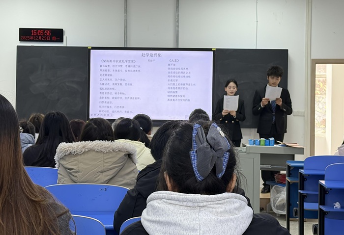本届大赛共收到来自各年级学生的投稿作品数百篇,参赛题材丰富,涵盖传统诗歌、散文、小说及新兴的AI文学创作等多个门类。经过专业评审,最终评选出各类奖项若干。典礼上,姜金元主任现场吟诵了宋代词人柳永的《八声甘州·对潇潇暮雨洒江天》,通过富有感染力的演绎,展现了古典诗词的韵律之美,令在场师生深切感受到中华优秀传统文化的艺术魅力。