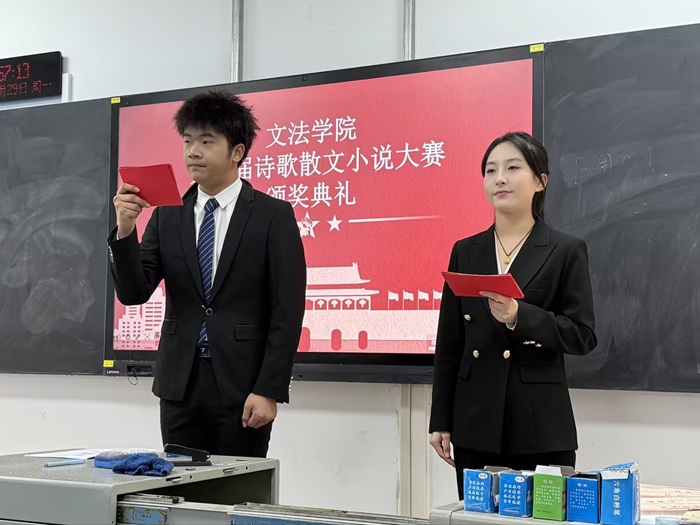 颁奖环节中,获奖学生依次上台,从与会老师手中接过荣誉证书。原创类散文诗歌小说及AI创作类各奖项依次颁发,现场气氛热烈。典礼上,文法学院法学2501班冯佳润朗诵了《云和叙》《对月咏怀》等作品,以细腻的情感表达展现出诗歌的意境之美,汉语言2503班毛书瑀带来的《赴学途兴集》,则以饱满的热情抒发了学子对知识的渴求与对未来的憧憬。精彩的朗诵表演赢得了现场阵阵掌声,进一步烘托出浓厚的文学氛围。