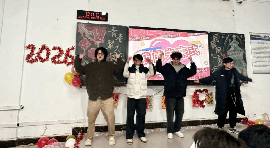 开场舞《我的未来式》动感十足;歌曲《用尽我的一切奔向你》唱出逐梦热忱;小品《大学生生活指南》诙谐幽默,引得笑声连连。“你画我猜”互动游戏中,同学们为“民族”“青春”等词条使出浑身解数,默契配合将气氛推向小高潮。