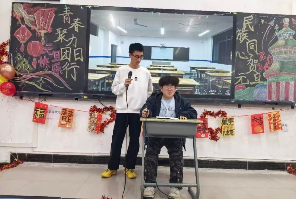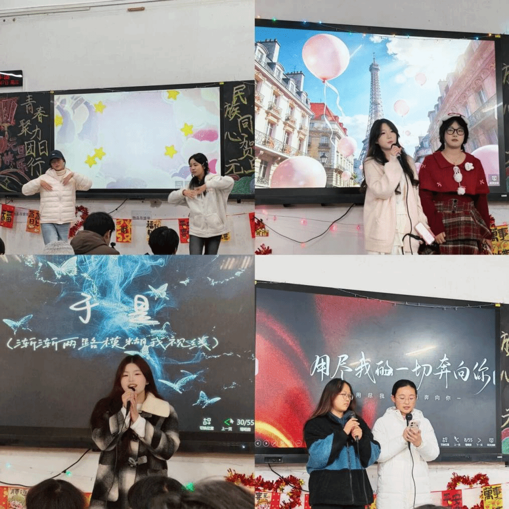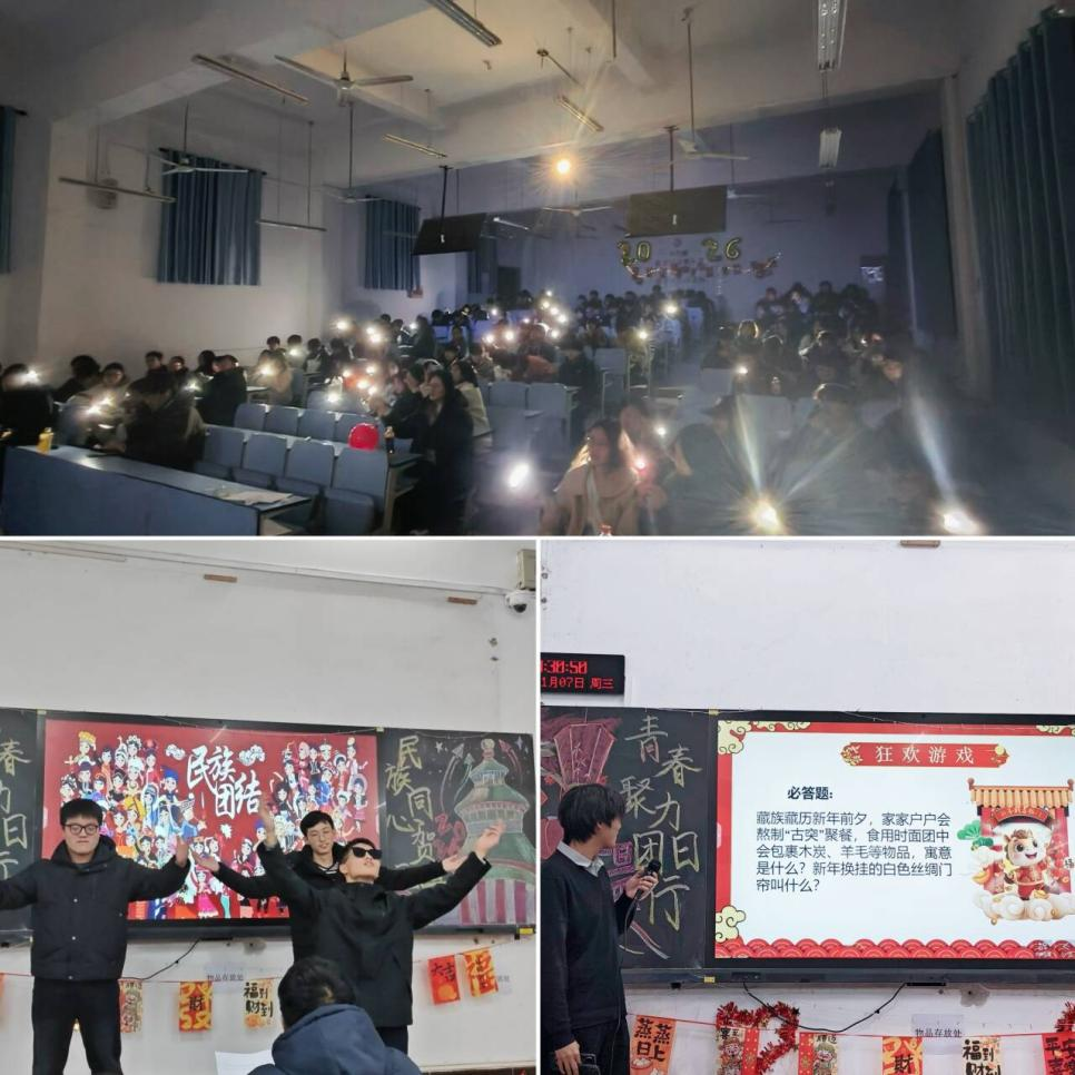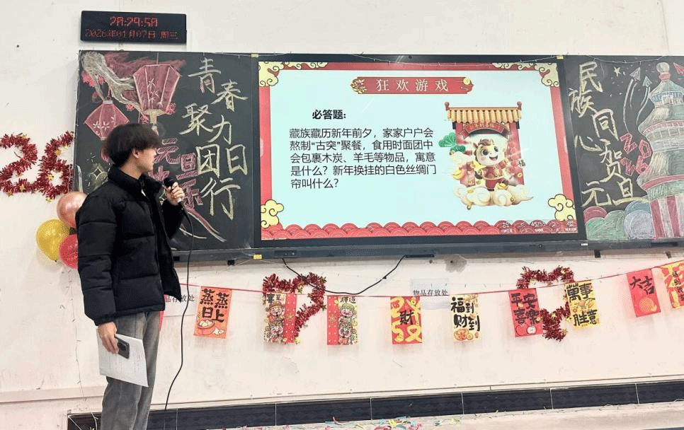 “新年新语·民族文化猜猜乐”环节高潮迭起。土家族同学龚昕分享:“我们过年叫'过赶年',除夕夜吃腊蹄子、糍粑,初一跳摆手舞祈福。”满族同学王浩然介绍:“我们过年吃'八大碗',晚辈向长辈行跪拜礼,领'压岁钱'求平安。