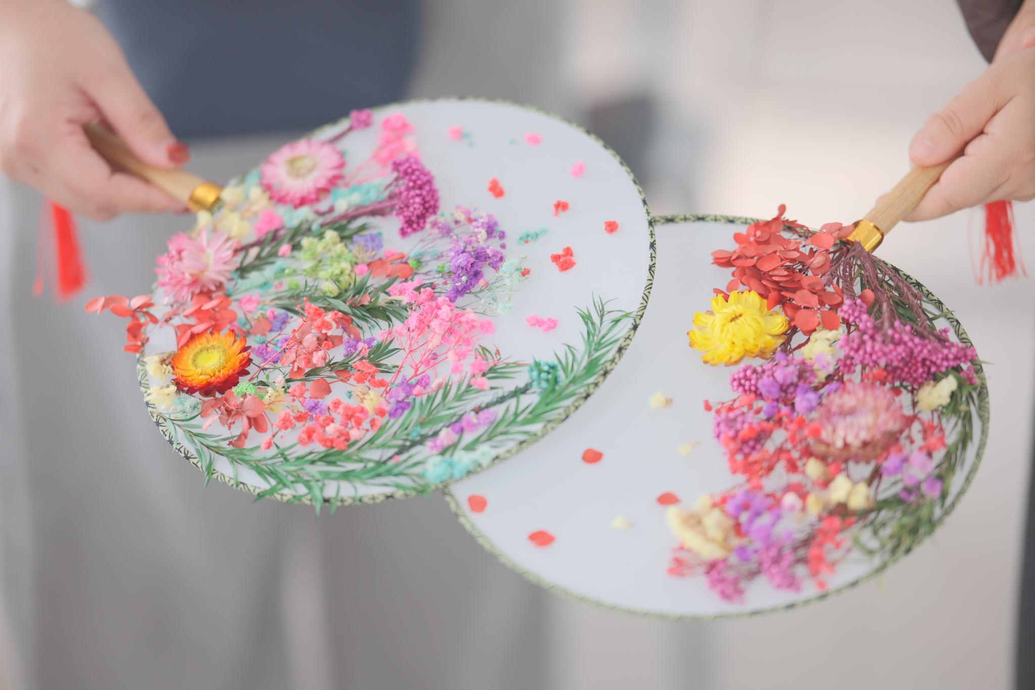在主持人的简要介绍与引导下,女教职工们纷纷执扇拈花,巧手创作。大家或精心构思布局,或彼此交流心得,在素面团扇上点缀各式永生干花,一幅幅清雅别致的图案渐次呈现。现场氛围轻松融洽,欢声笑语不断。制作间隙,商学院还准备了精美茶歇,老师们品尝甜点、分享作品,并互相拍摄留念,在互动中进一步放松身心、加深情谊。