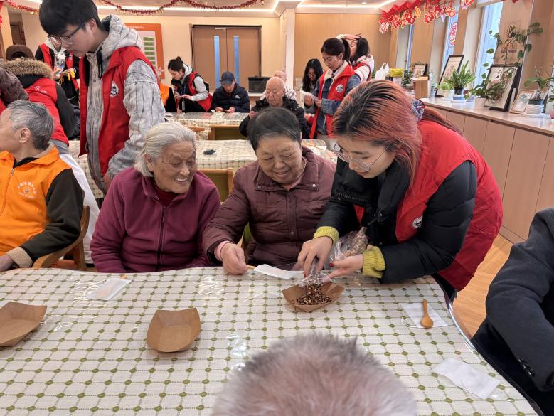 手工制作香囊环节成为本次活动的一大亮点,老人们围坐在桌前,志愿者们将提前准备好的五彩香囊包、香料等材料一一摆放整齐。考虑到部分老人视力不佳或手指不够灵活,志愿者们便俯下身子,耐心地协助老人打开香囊包、填充香料、系紧绳结。在志愿者的悉心帮助下,一个个色彩斑斓、造型精致、饱含着美好祝福的香囊逐渐成型。老人们一边制作,一边和志愿者们聊天,现场氛围温馨融洽。欢声笑语驱散了午后的寂静,让整个空间都充满了融融暖意。