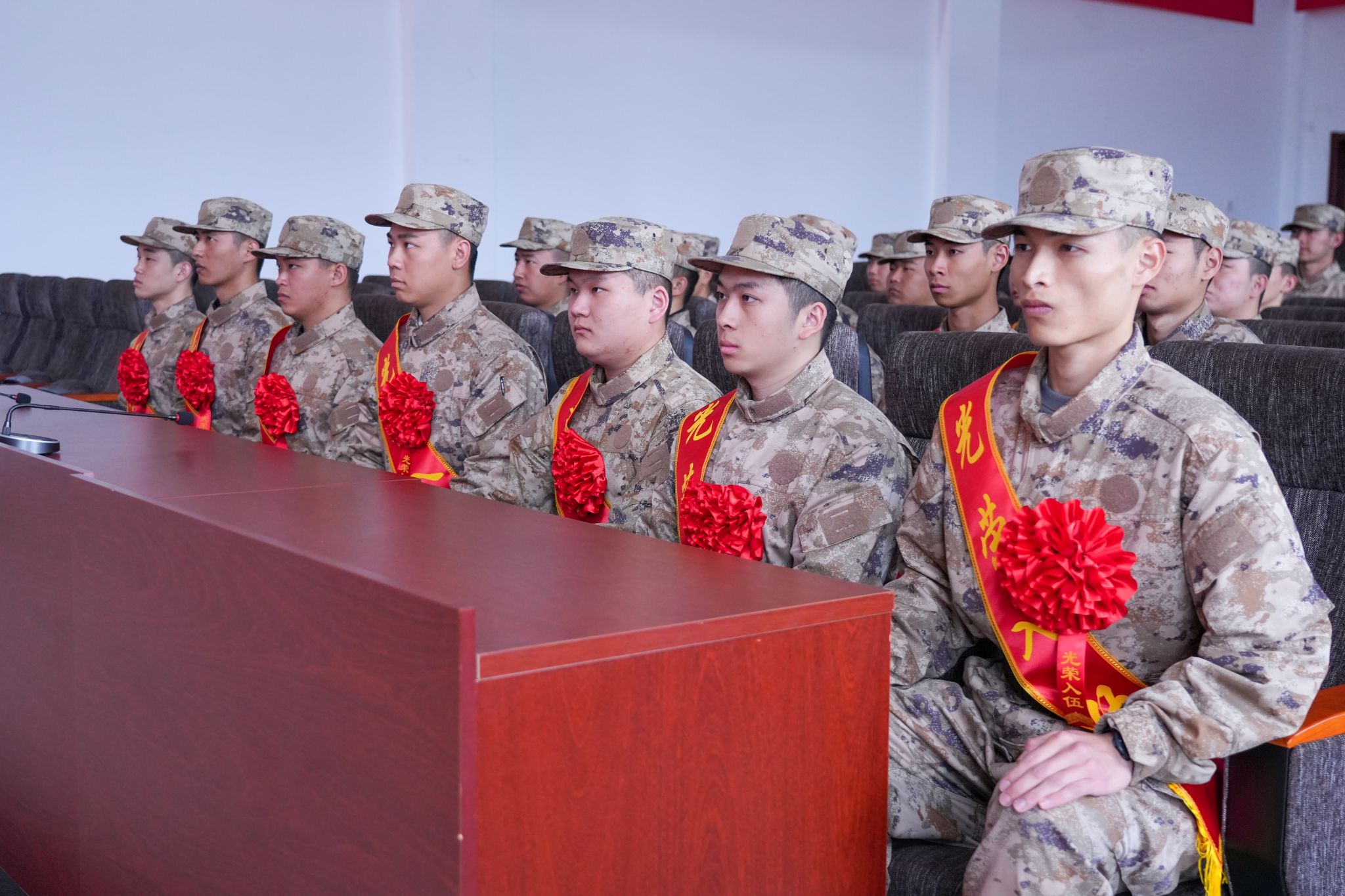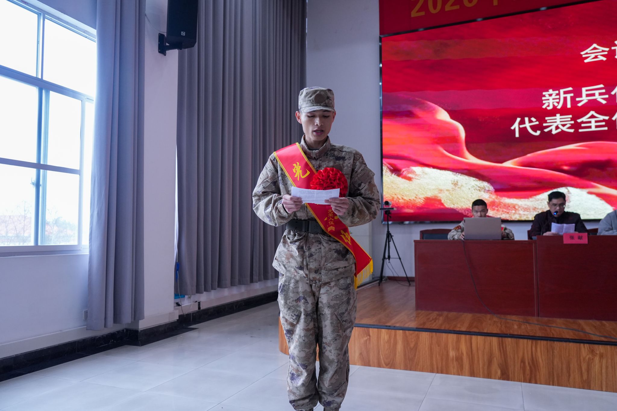仪式在雄壮的《强军战歌》声中正式启幕,全体人员肃立齐唱,激昂嘹亮的旋律在会场久久回荡。新兵代表袁建进同学上台发言代表全体新兵表决心,表达了参军入伍的光荣与自豪,并对母校的培养致以诚挚谢意。他代表全体新兵郑重承诺:“我们将秉承母校追求卓越,走向成功的校训精神,严守纪律,在军营大熔炉中淬炼成钢,用青春热血谱写无悔军旅人生!”发言结束,全场响起雷鸣般的掌声。