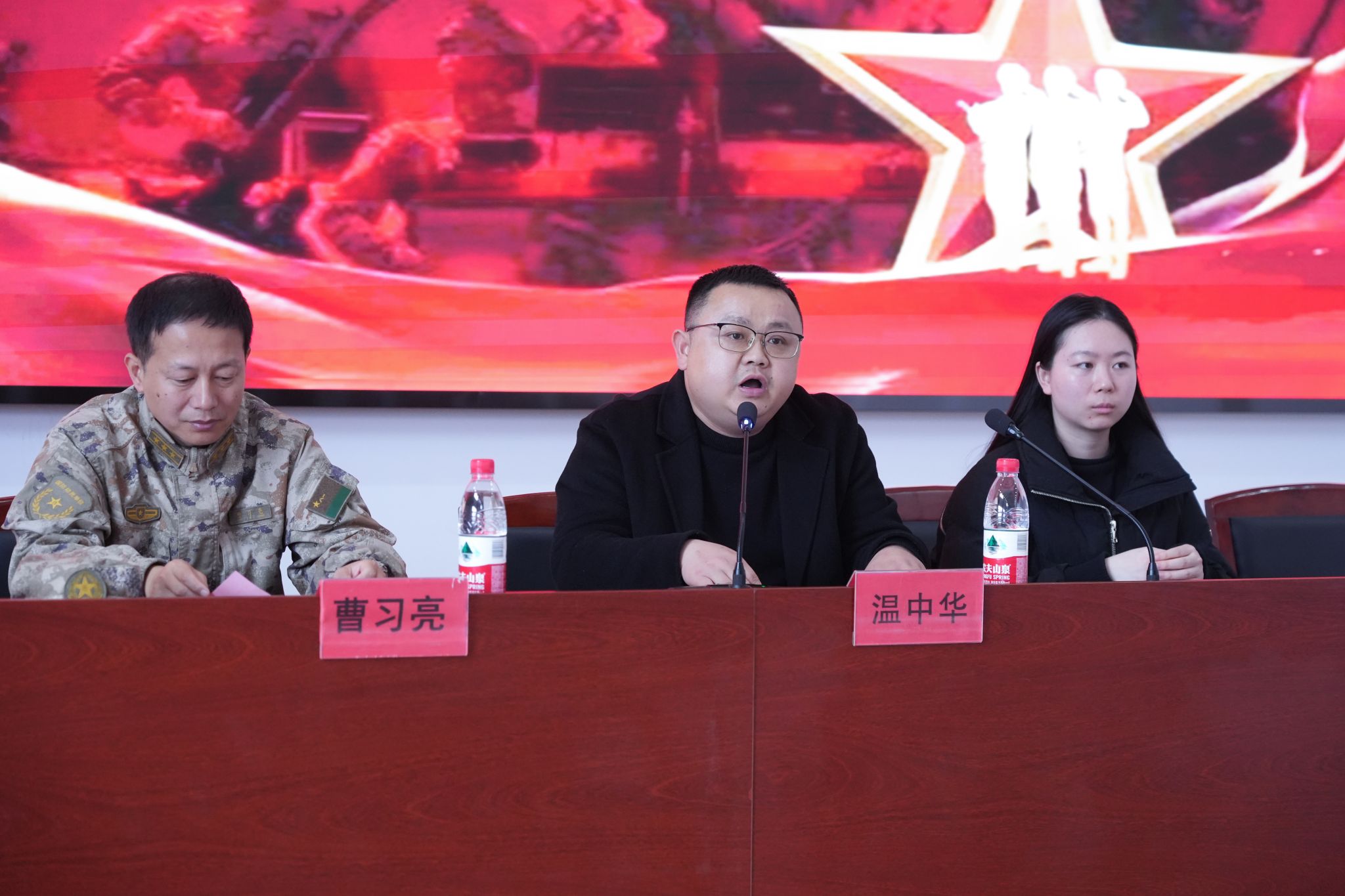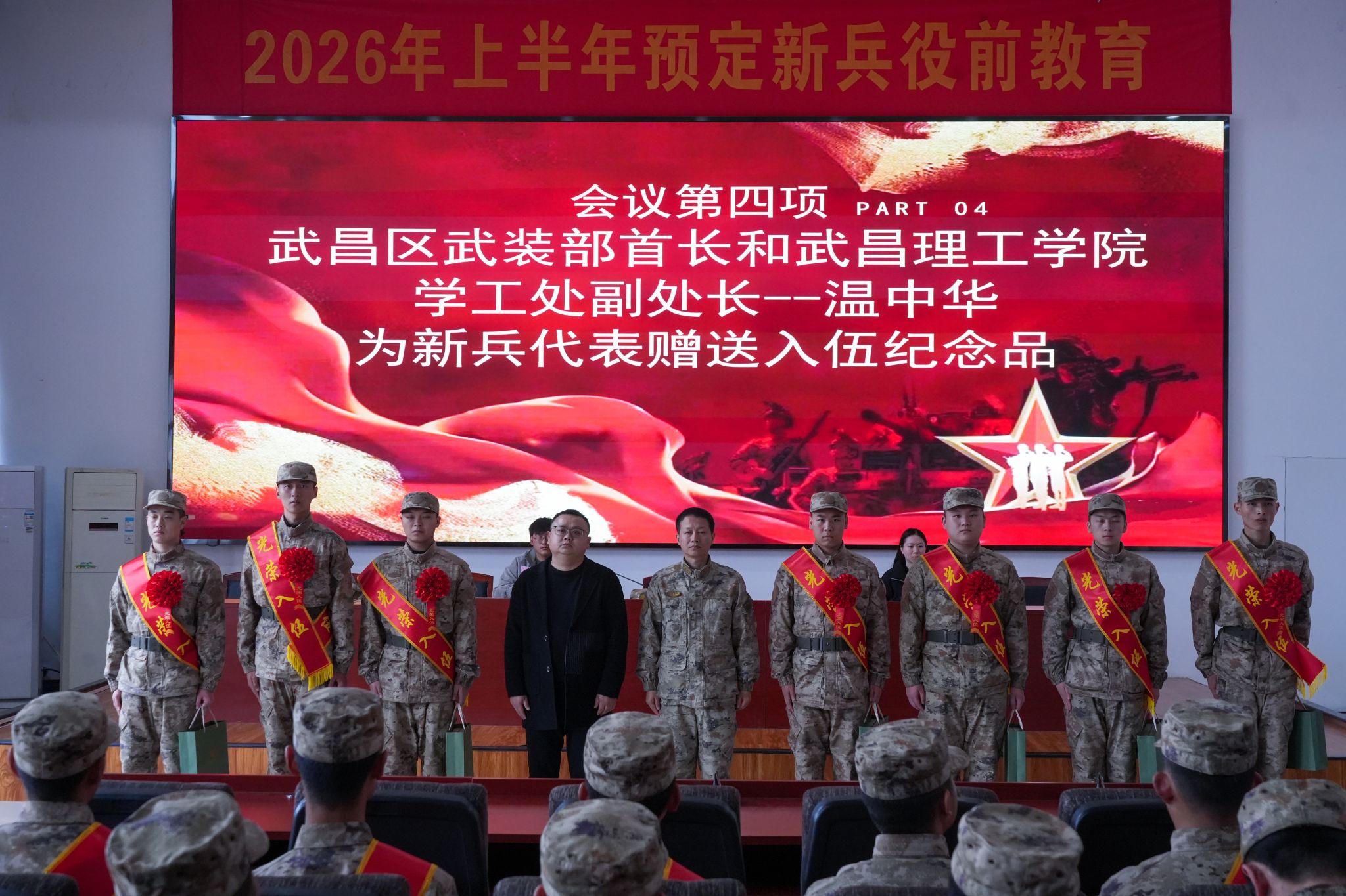 随后,区人武部上校政委曹习亮和学校学工处领导共同为新兵代表赠送入伍纪念品,这份纪念品承载着武昌理工学院与武昌区武装部对新兵的深切期盼,激励他们建功立业。新兵们接过纪念品,脸上流露出自豪,眼神里透着奔赴疆场的坚定。