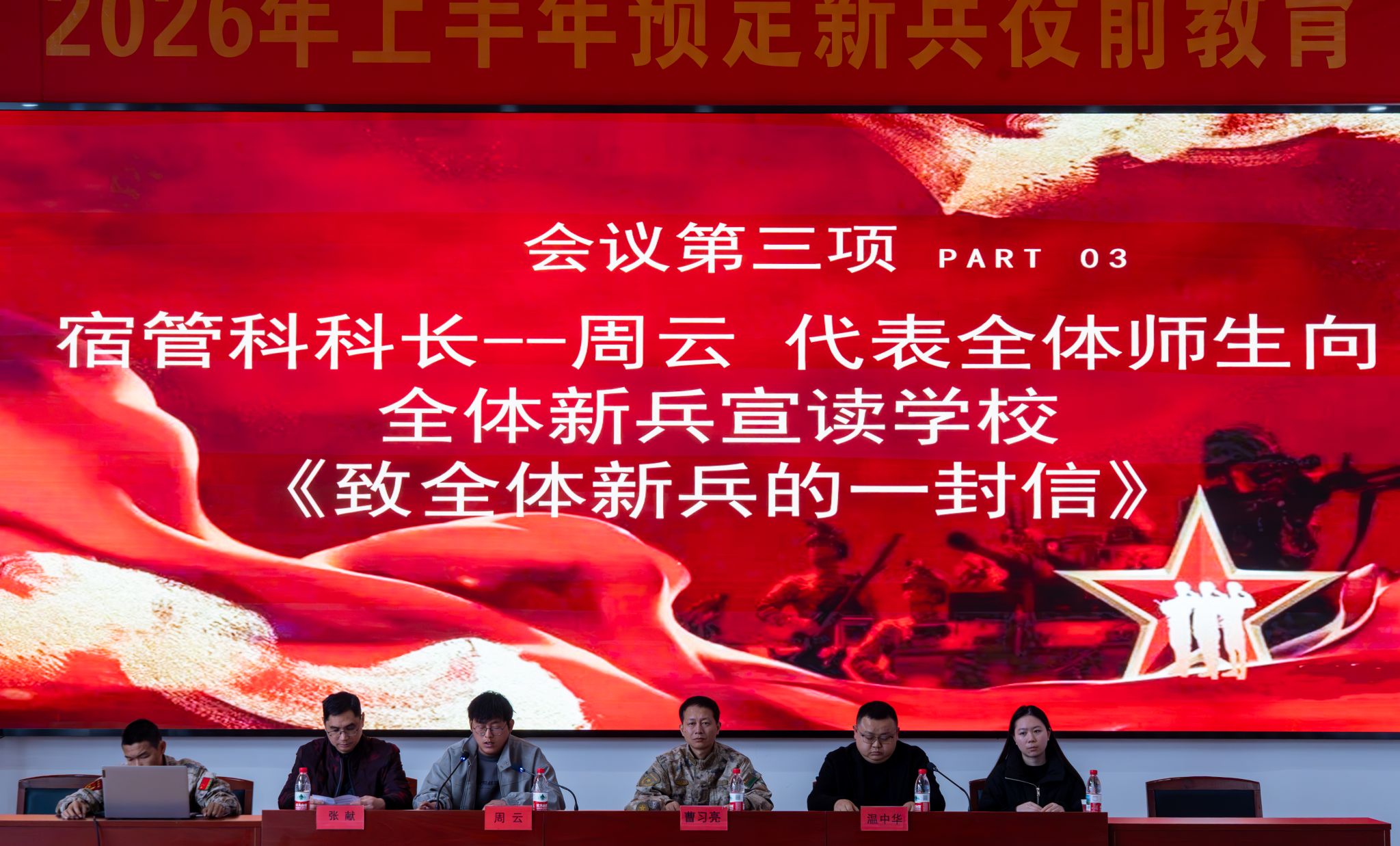 学工处宿管科科长周云现场宣读《致全体新兵的一封信》。信中,他向即将奔赴军营的学子表示殷切期望,希望他们在军营中淬炼意志、增长才干,将所学融入强军实践,早日实现从在校学生到合格军人的转变。字里行间凝聚着温情与嘱托。