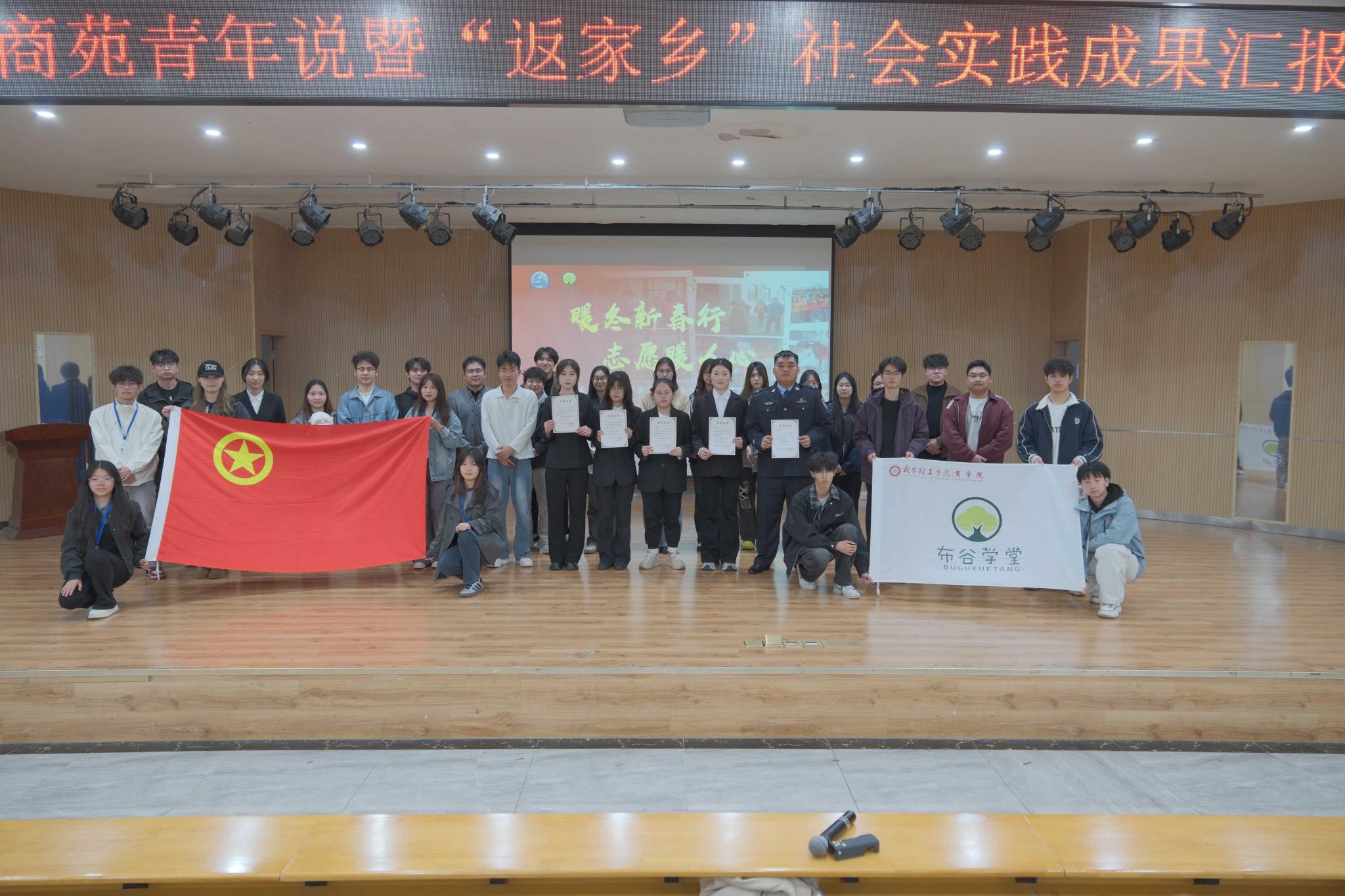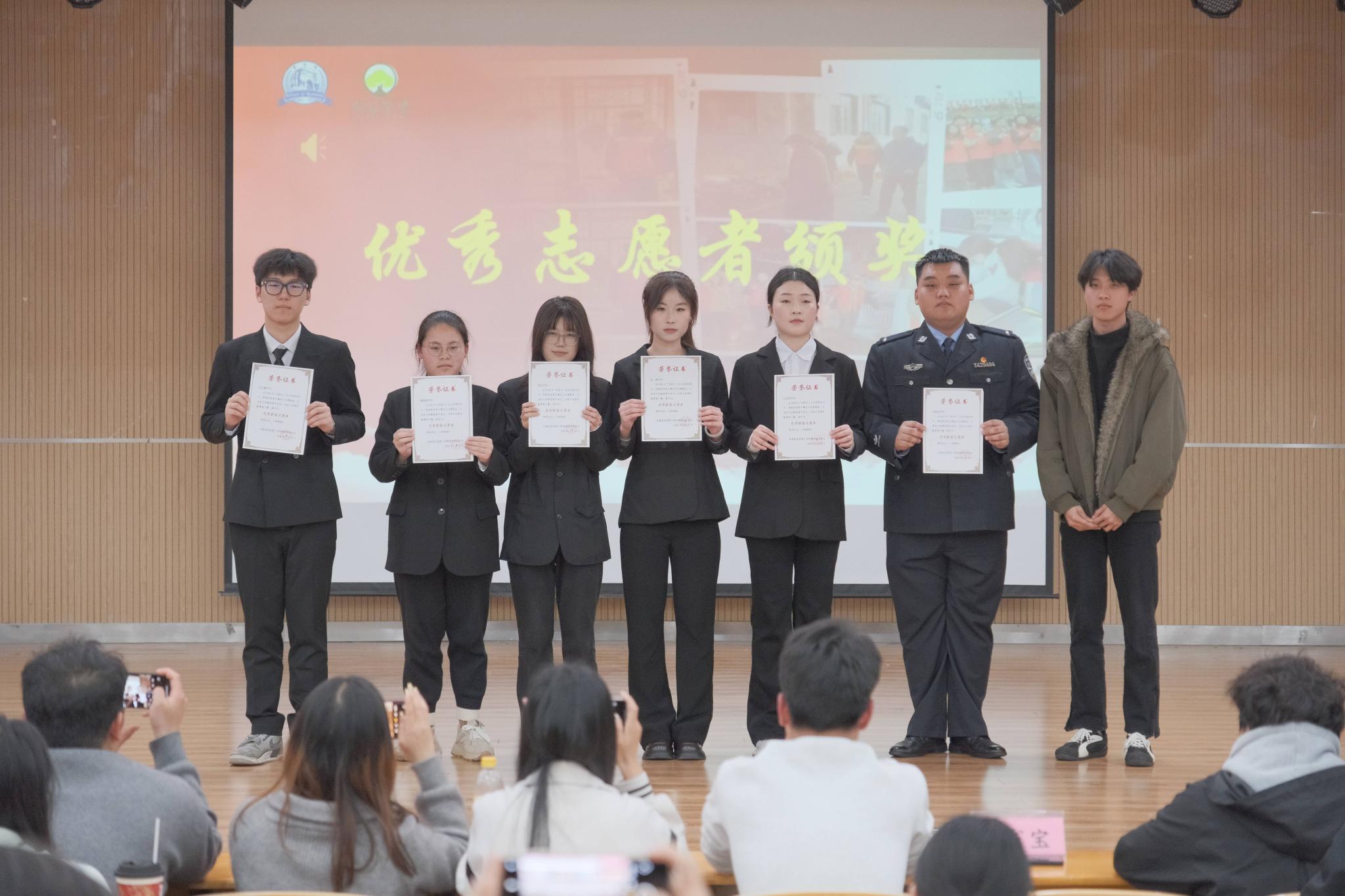 学子分享结束后,活动进入“优秀新春志愿者”颁奖环节。经过前期严格评选,一批在寒假志愿服务中表现优异的同学荣获表彰,商学院学生会主席邓省宝为获奖同学颁发荣誉证书并合影留念,榜样的力量让现场氛围推向高潮。