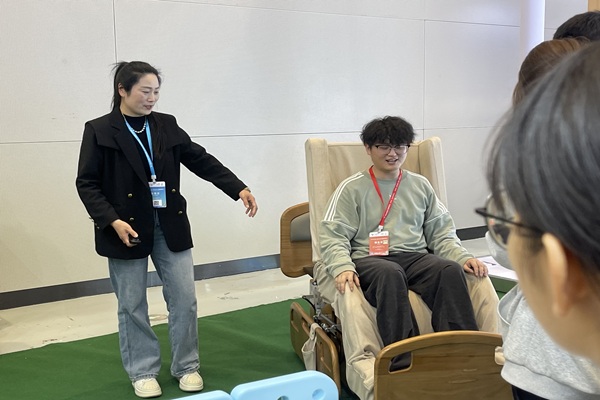 在适老化智能康养设备展区,工作人员现场演示多功能康复护理椅体位调节、卧床辅助、居家照护等全维度功能,让同学们亲身入座体验,直观感受智能康复辅具在老年照护、肢体康复领域的创新设计,将课堂康复评定、老年护理专业知识与一线康养场景深度结合,真切体会到康复护理专业在银发健康事业中的实践价值。