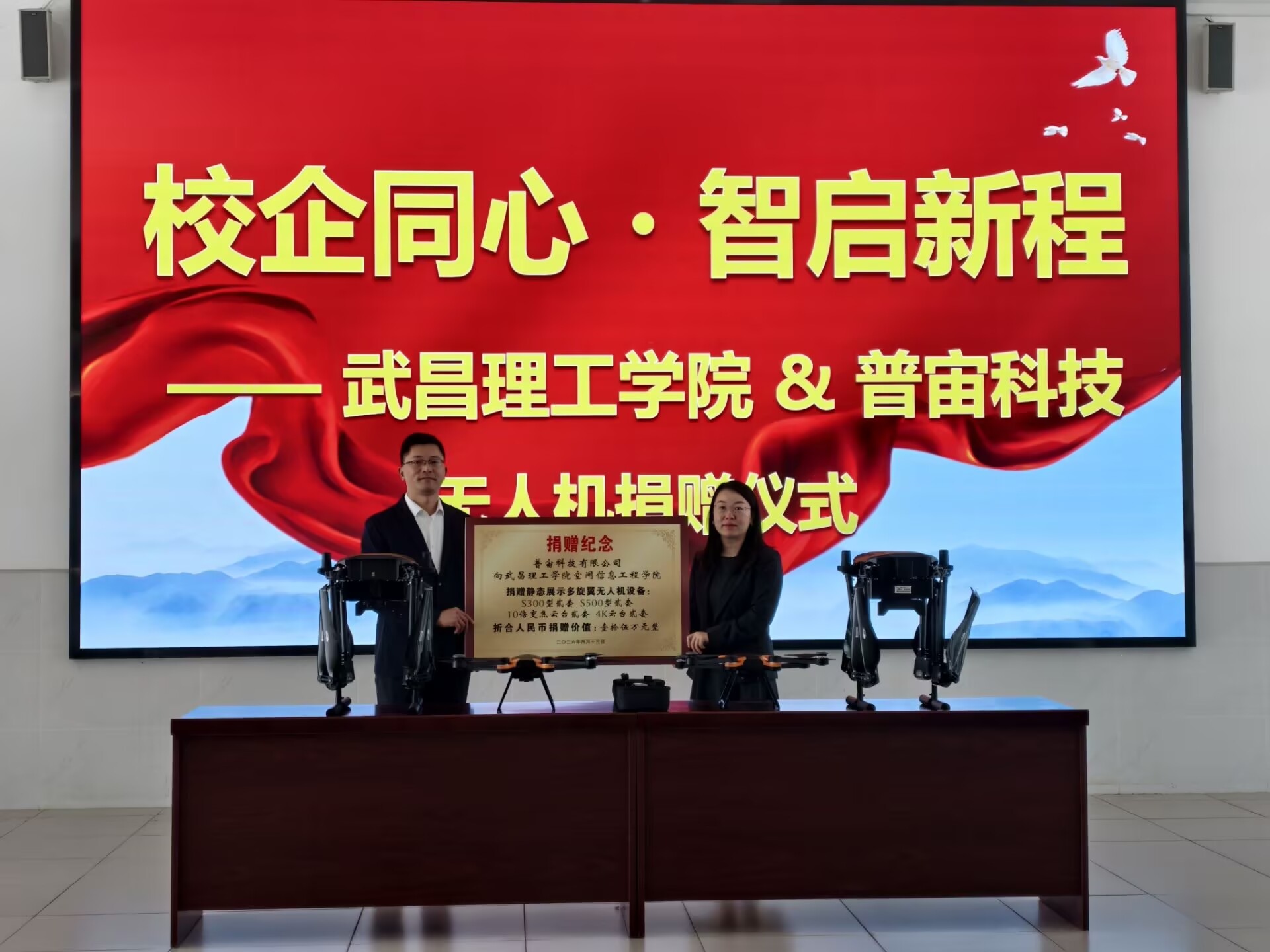 致辞结束后,活动进入设备捐赠环节。与会嘉宾移步至学院一楼大厅,共同见证普宙科技向武昌理工学院捐赠一批先进无人机教学设备的仪式,陈虎总经理向赵小睿校长助理递交了捐赠铭牌。普宙科技黄俭总监现场介绍了所捐设备的型号、技术特点及其在无人机实训教学中的具体应用与性能优势,这批设备将显著提升学院在无人机领域的专业教学与科研实践能力。