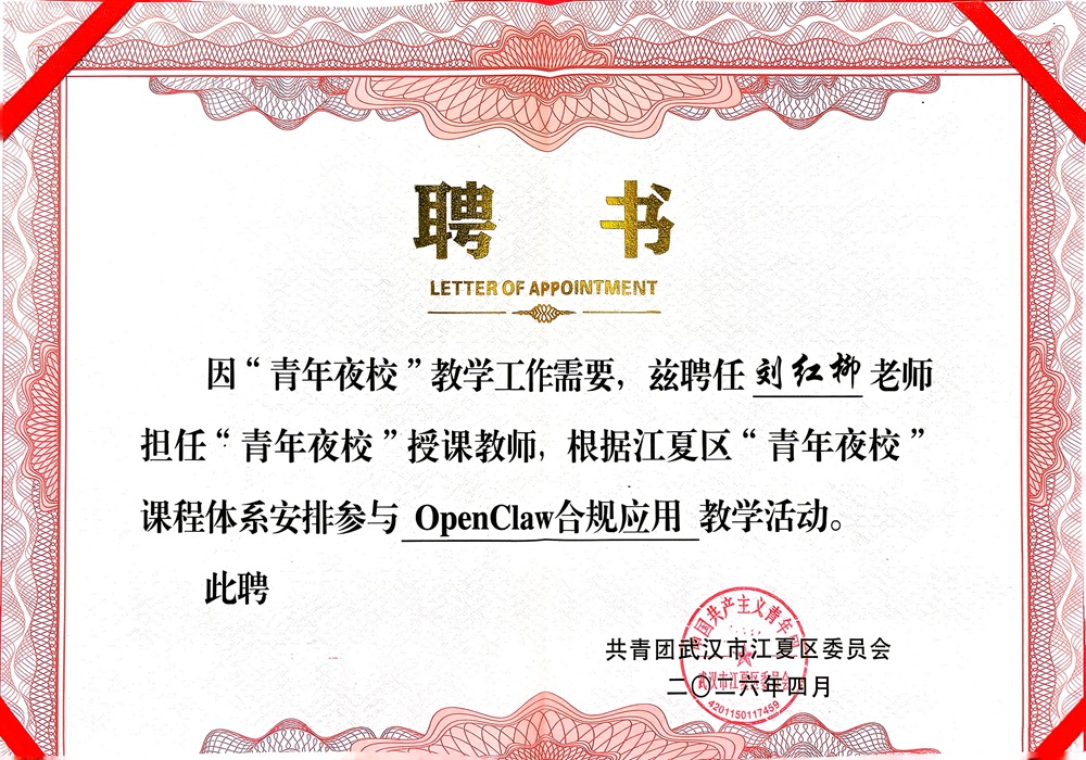 凭借扎实技术与实战经验,刘红柳被武汉市江夏区团委聘请为青年夜校讲师,常态化为学员传授AI教学技巧。同时多次受邀开展专业培训:为江夏科投集团主讲OpenClaw专题实操,手把手教学工具安装与场景配置;负责江夏区青年夜校OpenClaw部署教学;在洪山区青年夜校首发专场开展AI漫剧教学。