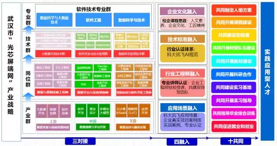合作伊始,双方立足武汉市“光芯屏端网”产业战略,依据“数据采集与基础资源构建-数据建模与平台开发-数据应用与服务实现”三个技术节点,梳理关键节点岗位和技术清单,厘清“产业—岗位—技术—专业”集群关系,构建“对接产业集群,对接岗位集群、对接技术集群”的“三对接”组群逻辑,主动服务湖北省“51020”现代产业集群体系发展的新一代信息技术产业,深度覆盖产业链中的软件和信息服务、算力与大数据、人工智能等关键领域。