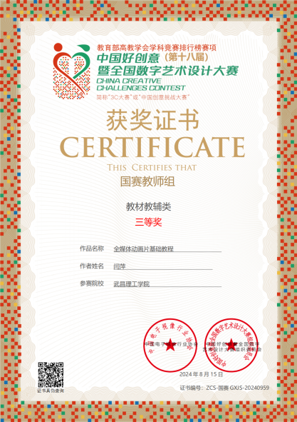 2019年,参加中国大学生计算机设计大赛,获得省级三等奖四项,2021年获得省级二等奖1项,三等奖3项,优秀奖2项;并荣获数字媒体设计专业组国赛三等奖;