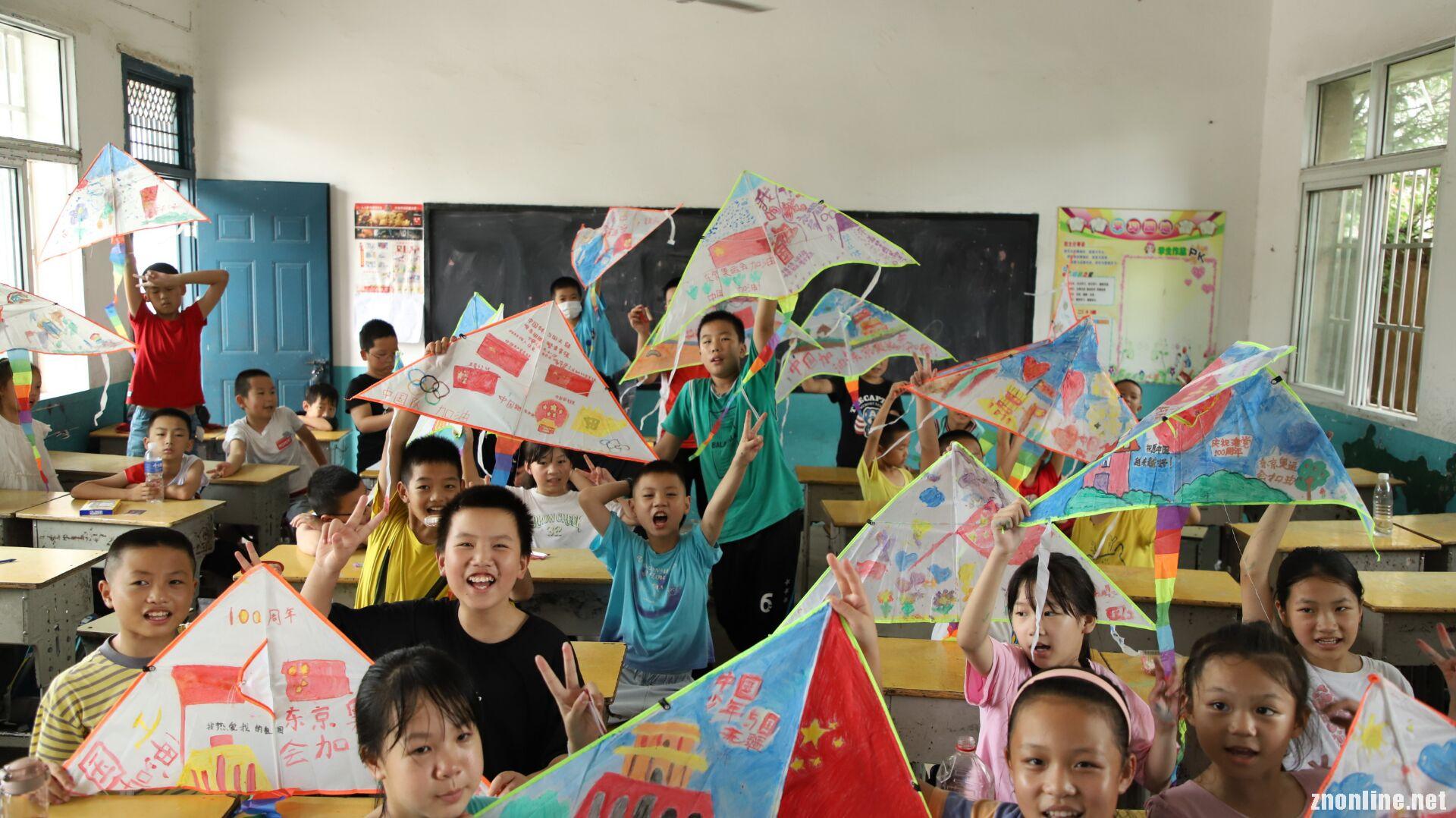 “老师,我想要画五星红旗!”“老师,我要画长城和奥运五环。”孩子们的声音此起彼伏。“老师,”一位叫王馨彤的小女孩说,“快来看看我画的红旗!我和我同桌画的!”高年级的曾翼同学说:“虽然我没有亲眼看见过天安门城楼,但是在电视机上看阅兵式的时候天安门城楼的样子已经深深映在了我的脑海里,所以我把天安门城楼、国旗和党旗画在了风筝上,来庆祝我们中国共产党成立100周年。”