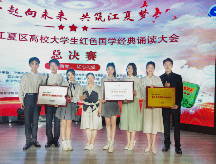在总决赛的颁奖现场,武昌理工学院荣获高校全民阅读合作单位、新时代文艺志愿服务合作单位和优秀组织单位三块荣誉奖牌。武昌理工学院影视传媒学院的学生们在此次的诵读大会深切表达着对伟大祖国的歌咏,以青春之声向祖国献礼,浓浓的民族自豪感充斥在在座每一名观众心间,赢得掌声阵阵。《永不消逝的声音》《红铁》作品中,武昌理工学院学子则以铿锵之音、坚定之心在饱含深情的歌颂中朗诵出青年一代“撸起袖子加油干”的坚毅。在同学们慷慨激昂的朗诵始终弥漫着武昌理工学院学子对前辈们的敬仰与感恩之情。