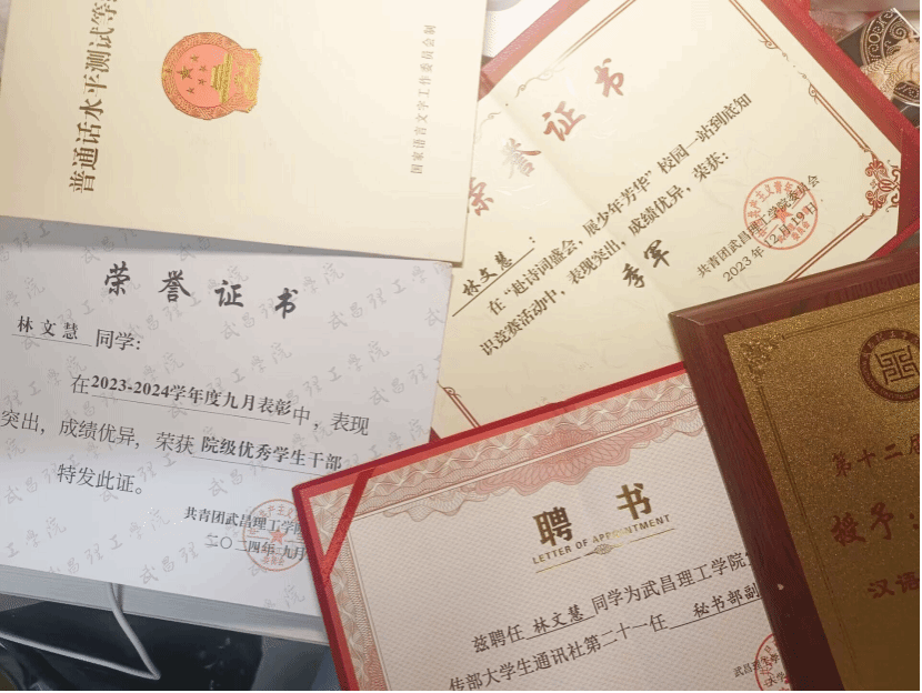 在文学创作与实践创新领域,林文慧同样成果丰硕。她的诗词作品《江城子·冬日伤怀》荣获梅南文学作品创作大赛一等奖,《冬韵悠长:心中的乡愁絮语》与《传承的火炬:新时代的召唤》分获冰心文学大赛初选一、二等奖,《冬日暖阳:忆故乡的温情与悔》获全国大学生文学作品大赛三等奖。由其参加的大学生创新创业训练项目《云梦秦简·律海迷踪》沉浸式推理文旅IP,因构思新颖、实践性强,被学校推荐为省级项目,充分体现了她的创新思维与实践能力。