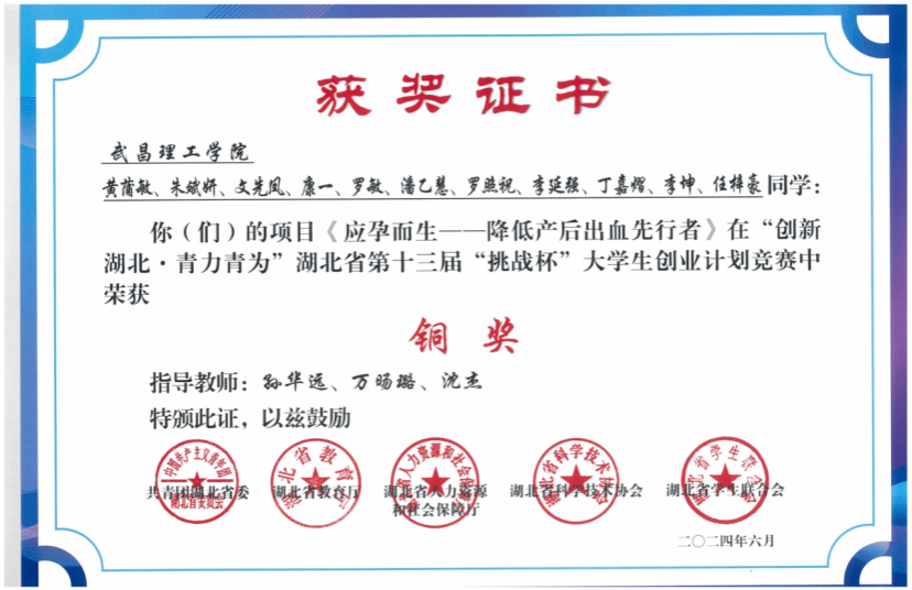 “知常明变者赢,守正创新者进。”在创新的道路上,黄蒲敏始终保持着敏锐的洞察力和勇于探索的精神。她积极参加各类创新创业大赛,在“挑战杯”大学生创业计划竞赛、中国国际大学生创新大赛等赛事中屡获佳绩。在第三届“创祎杯”全国大学生创新创业大赛中,她负责的《孕产无忧——健康中国下降低产后出血新策略》项目荣获中部赛区金奖,并成功晋级全国总决赛。这些成绩充分展现了她在创新创业领域的扎实功底和创新思维。