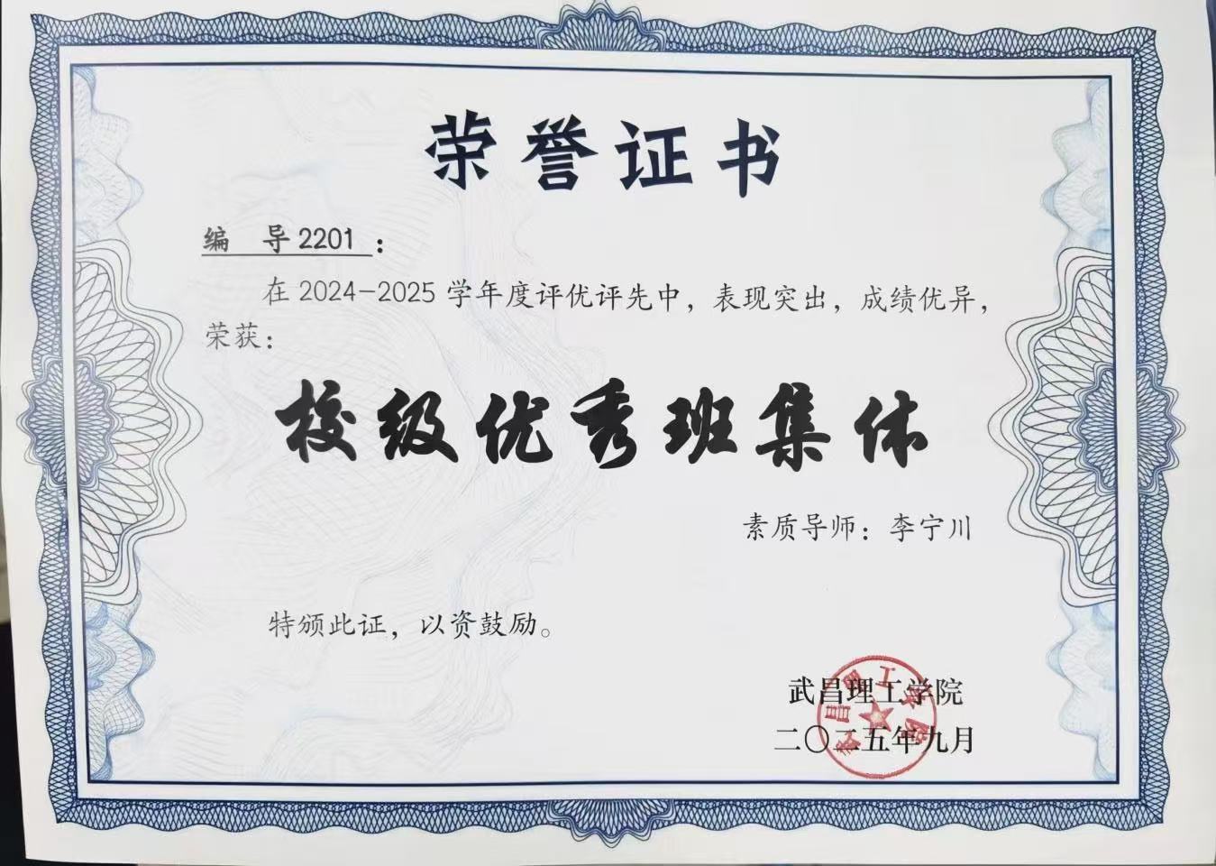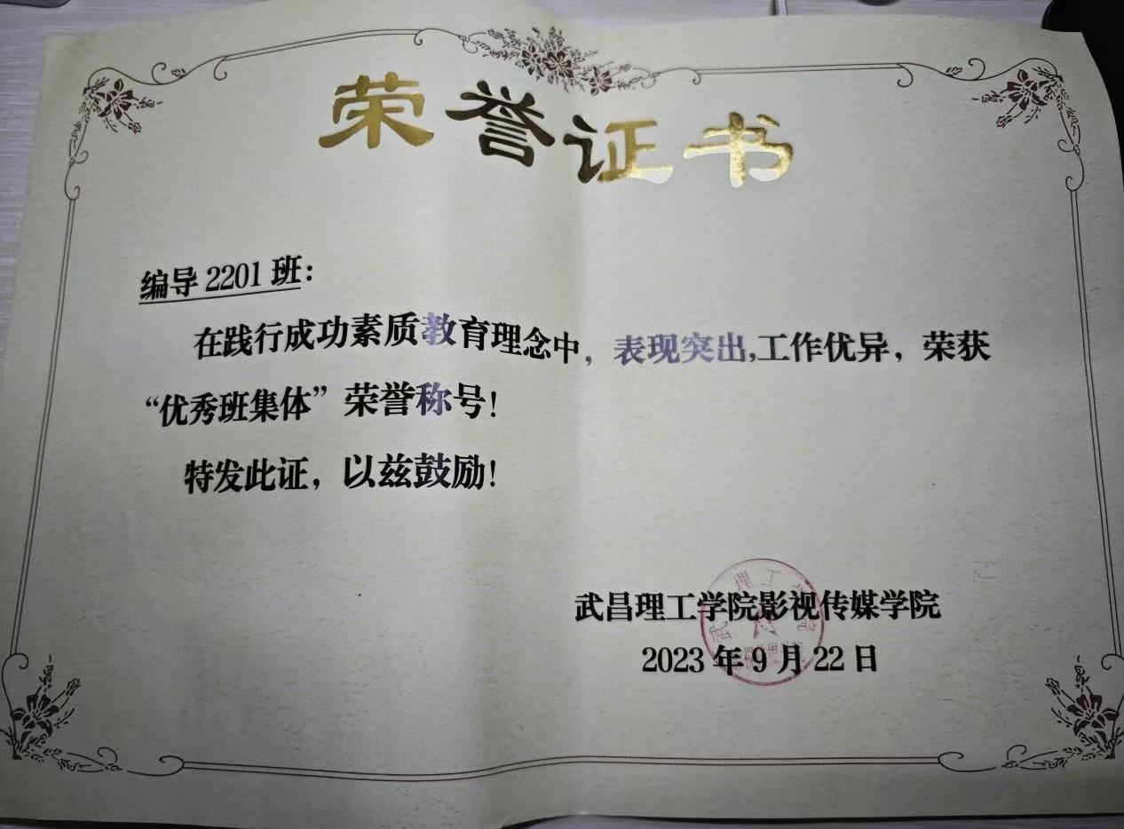 武昌理工学院影视传媒学院广播电视编导2201班在素质导师的悉心引领与班委团队的高效带动下,班级凭借严谨的班风学风、强劲的凝聚力与丰硕的实践成果,于2024-2025学年从众多班级中脱颖而出,荣获武昌理工学院“校级优秀班集体”荣誉称号。