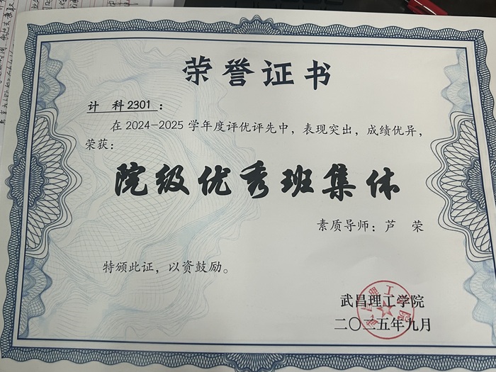 武昌理工学院人工智能学院计算机科学与技术2301班是一个由46名学生组成的集体。在素质导师芦荣的带领和全班同学的并肩奋斗下,该班获得2024-2025学年“院级优秀班集体”荣誉称号。班级成员构成多元有序,包括5名预备党员、3名发展对象、9名入党积极分子和22名团员。这种梯队化的思想建设为班级奠定了团结进步的基础。