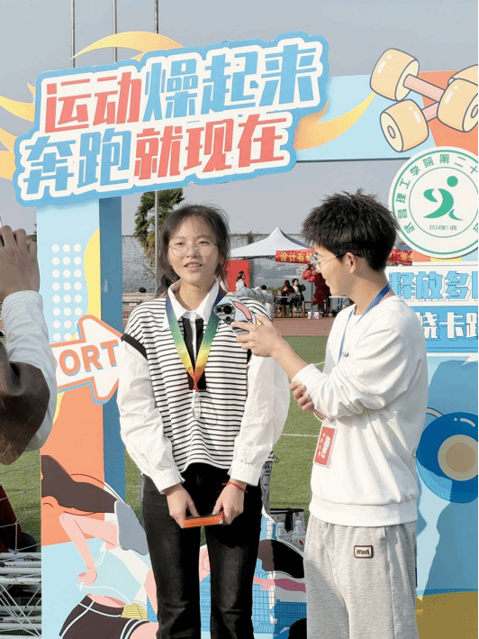 学生工作之外,陈明娇以镜头定格支教微光,以脚步丈量赛场锋芒。在十九届“大手牵小手”社会实践中,她担任崇阳筑梦志愿服务队副队长,作为宣传工作的负责人,她精心打磨每一段视频,让支教生活通过网络平台生动呈现。此外,运动场上也见证着她的拼搏。在武昌理工学院第二十届运动会中,陈明娇荣获女子4×100米第一名和女子400米第二名的好成绩,完美诠释了她身上不服输、敢拼搏的精神品质。