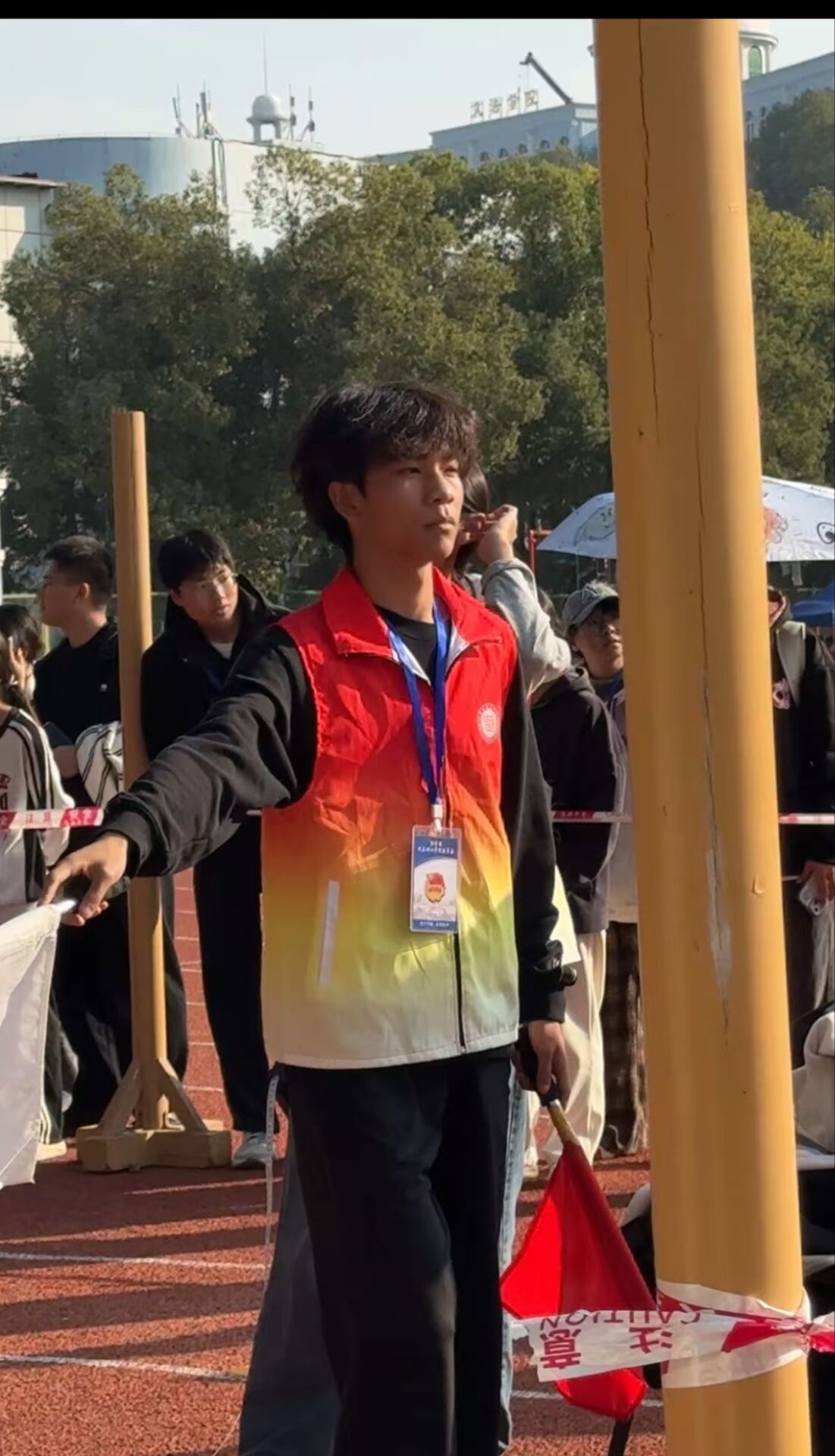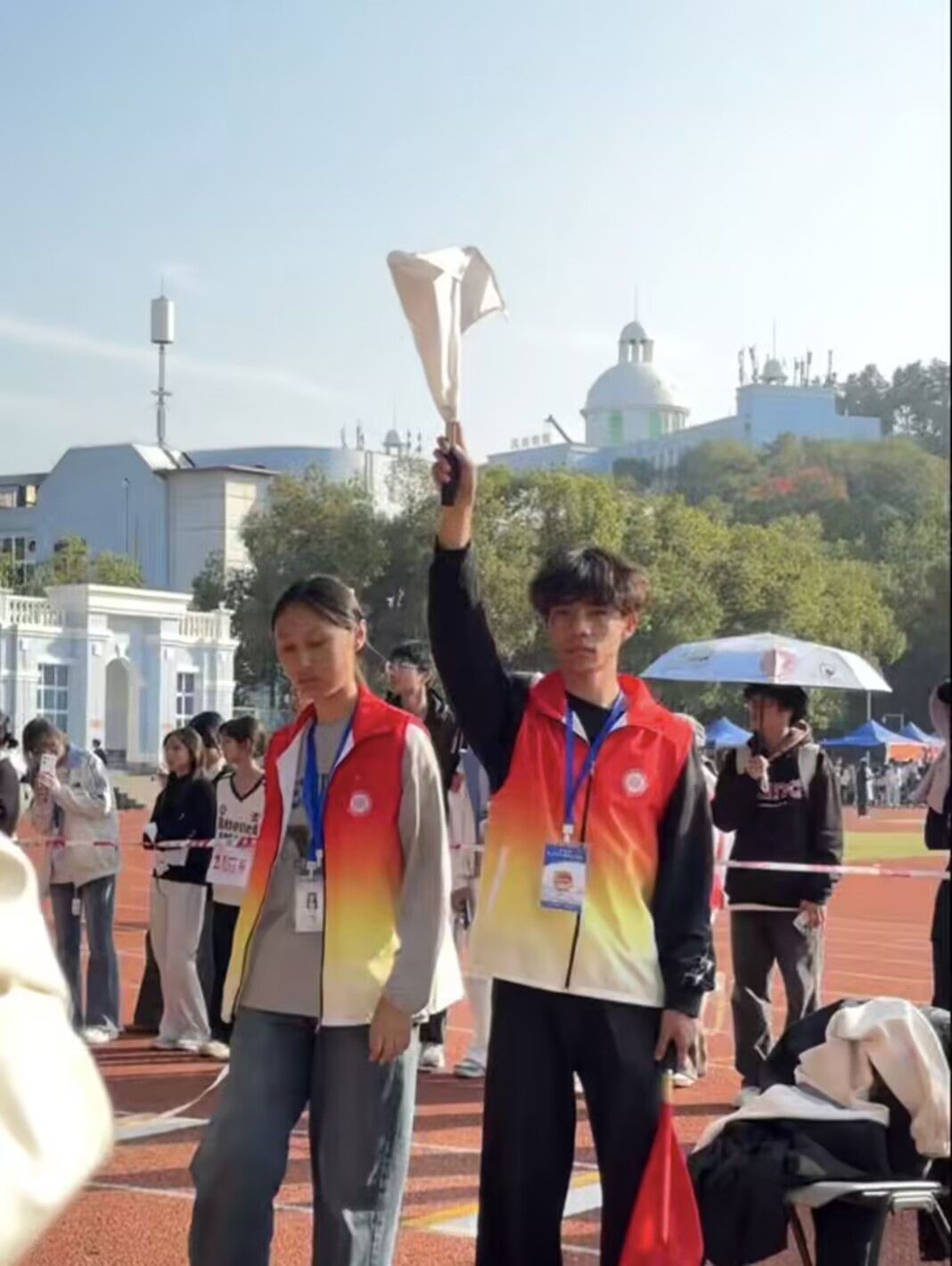 在跳远赛场上,裁判是赛场秩序的维护者,也是比赛公平的守护者。余文杰主动承担裁判的职责,恪尽职守,以高度责任意识维护赛场纪律,全力保障运动员安全,精准完成成绩判定,他以实际行动诠释了青年学子的责任与担当。