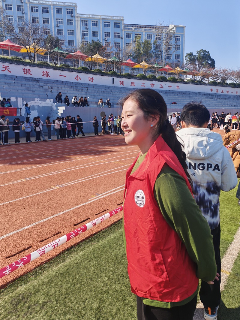 比赛期间,张熙钰在赛道内侧指定位置执行服务任务。她在运动员完成跑步项目后及时递上温水,并以简短语言给予鼓励。当有运动员冲过终点后出现体力不支的情况,她迅速上前搀扶,协助调整呼吸,并使用提前备好的冰敷袋为运动员膝盖降温,整个过程有序而稳妥。此外,她还协助引导观众有序观赛,及时回应师生需求,并主动清理赛道旁的杂物,维护赛场环境整洁,助力营造和谐有序的赛事氛围。